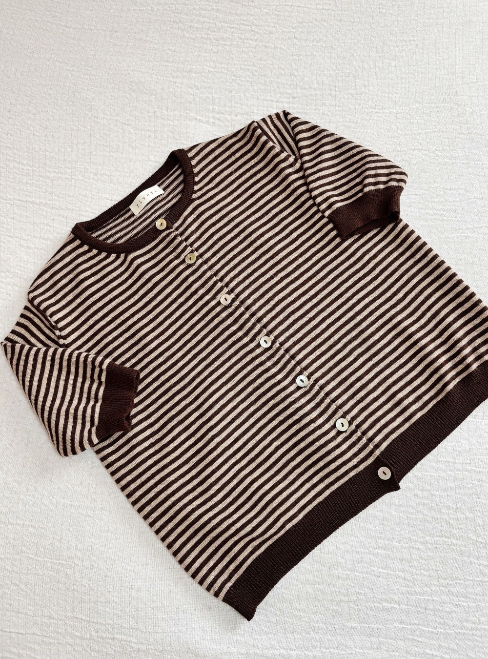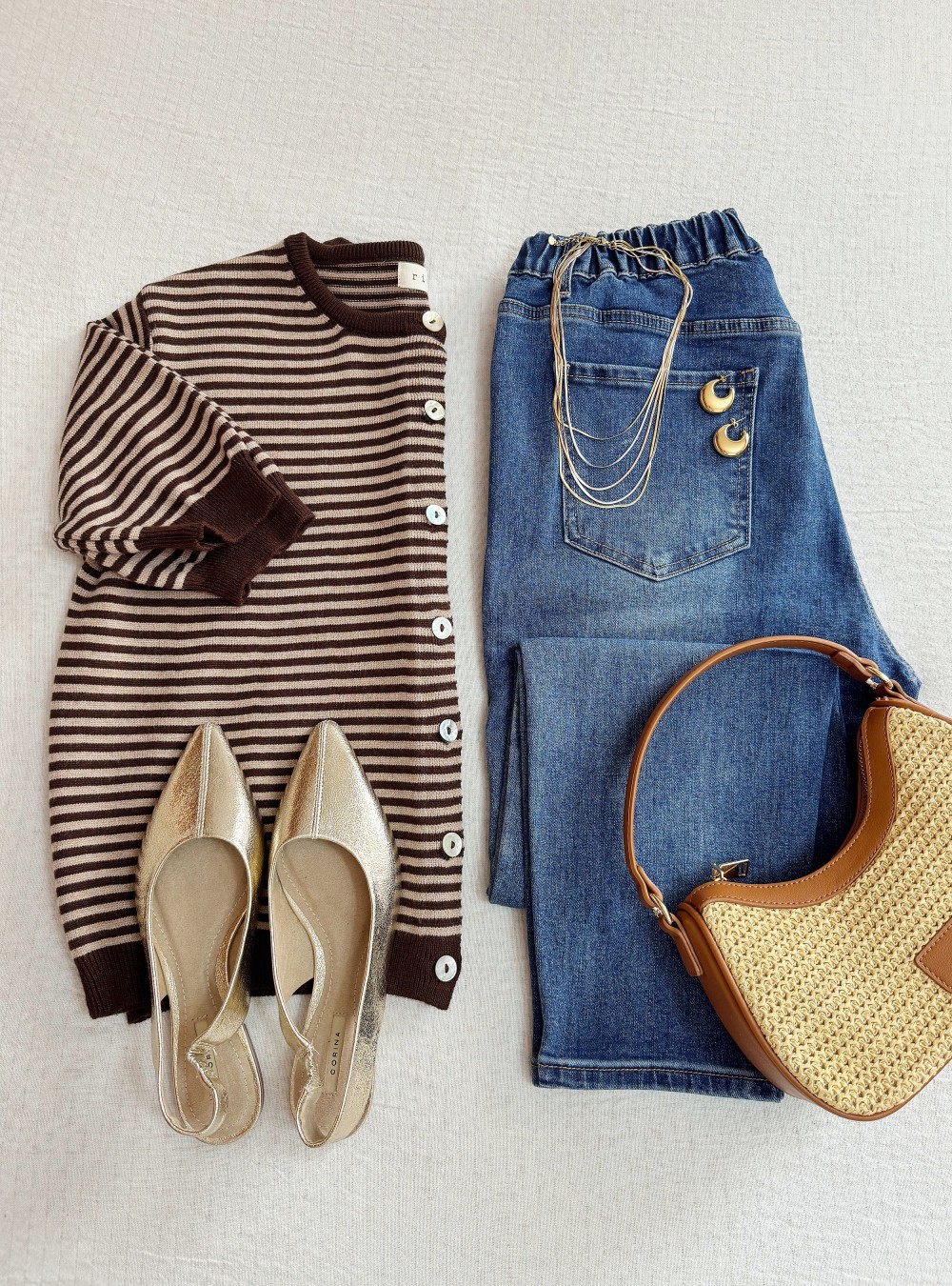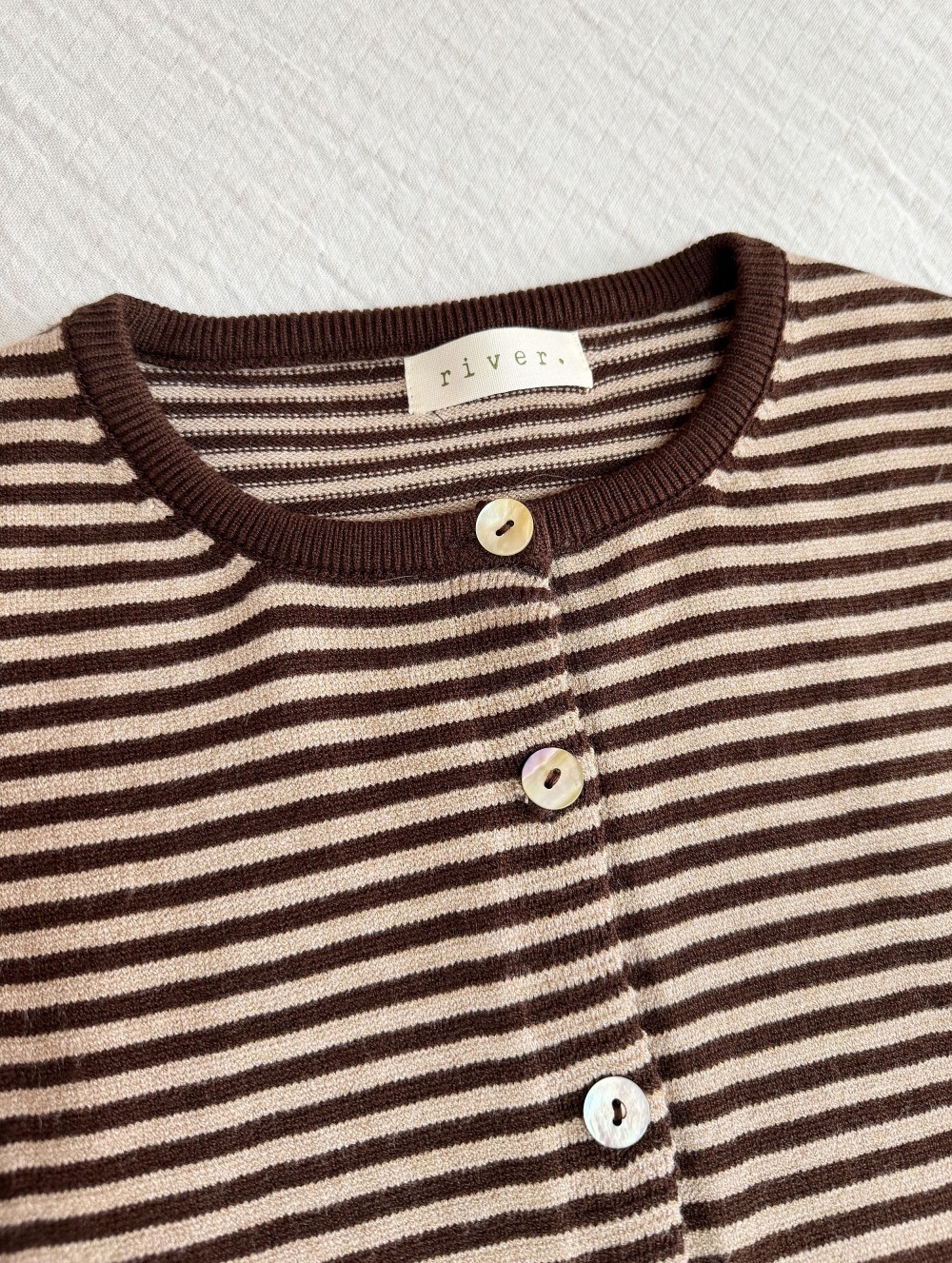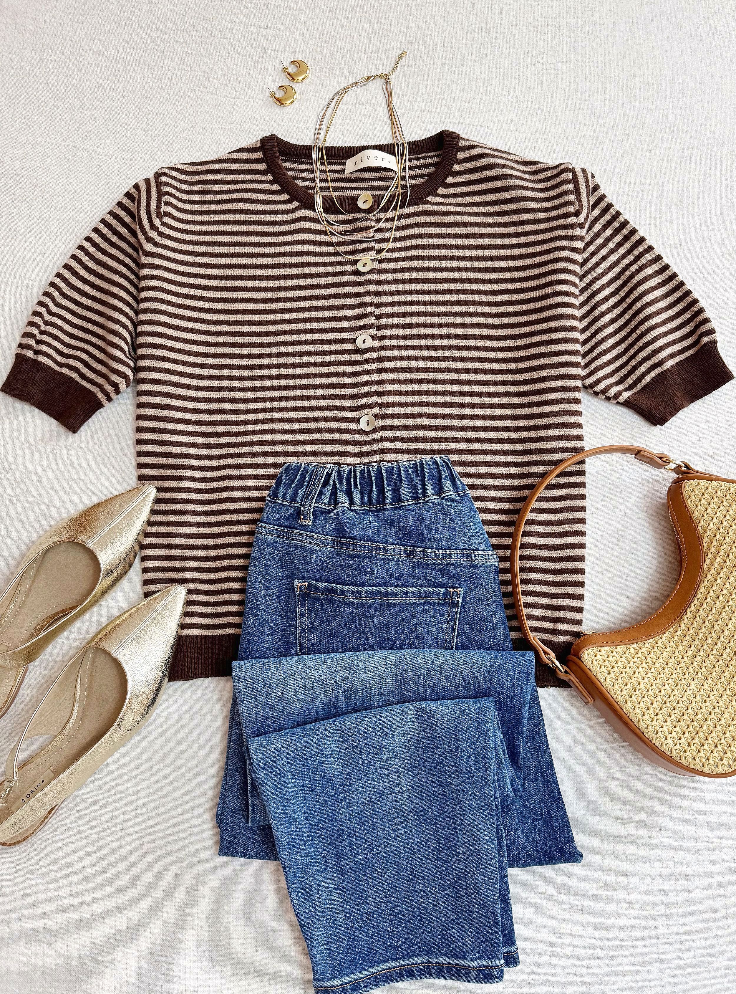 Chaqueta de punto y corte holgado con rayas en color marrón chocolate. Cuello redondo. Cierre por medio de botones de nácar. Tejido muy suave al tacto. Lo mezclé con unos jeans mom en azul medio y unos zapatos destalonado para un look casual pero muy estiloso.
