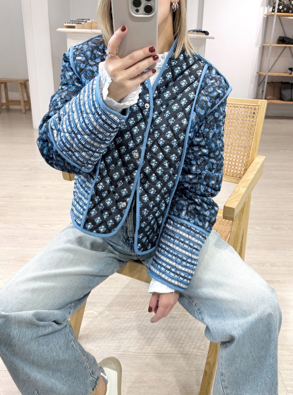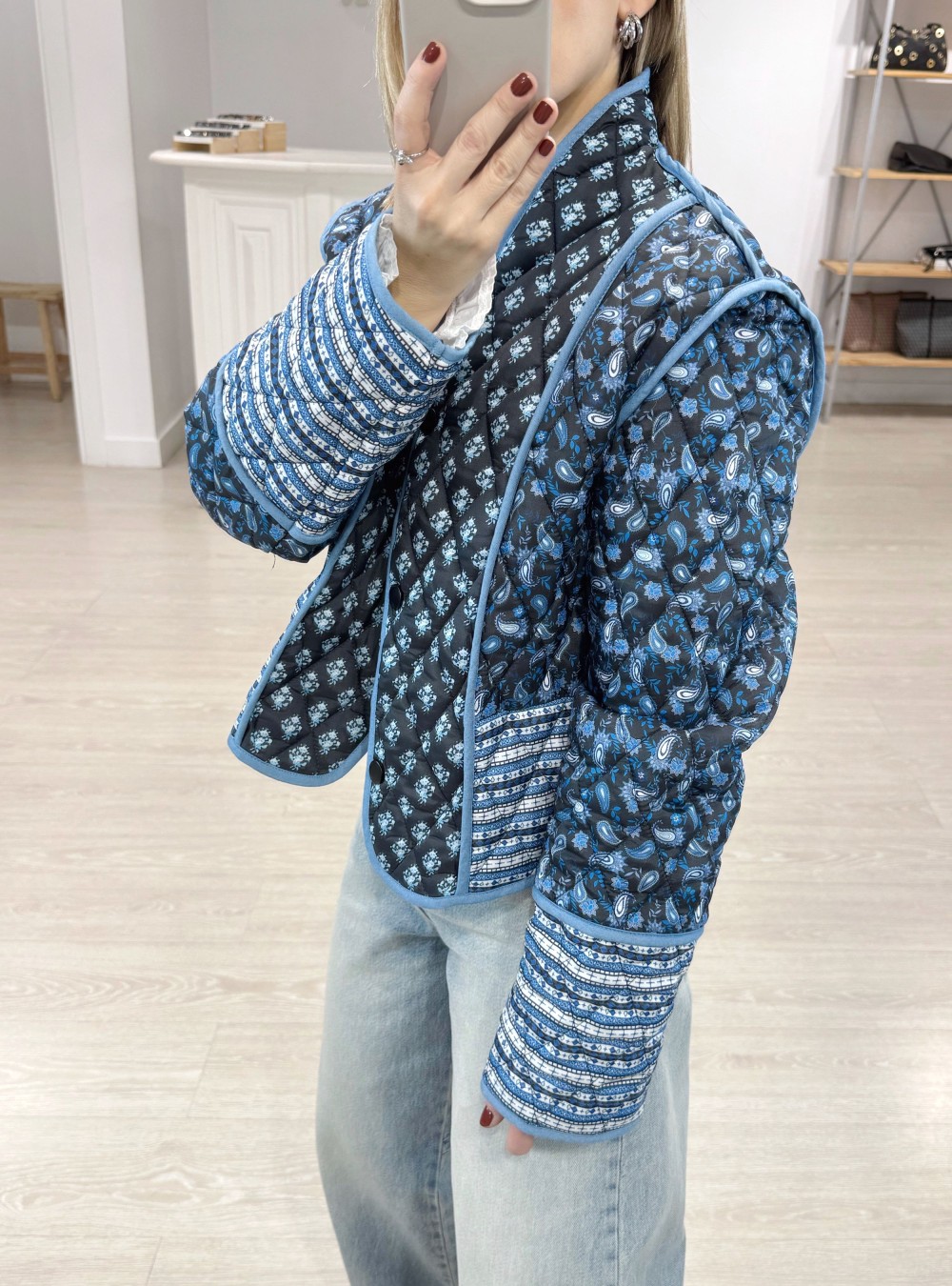 Chaqueta corta acolchada con estampado floral. Puedes mezclarla con una blusa blanca y un jeans básico para que todo el protagonismo sea para ella.
