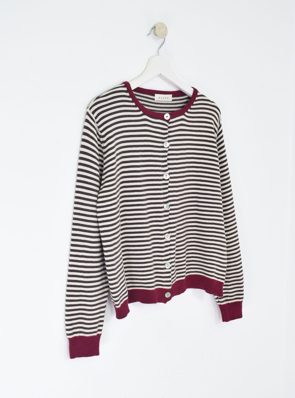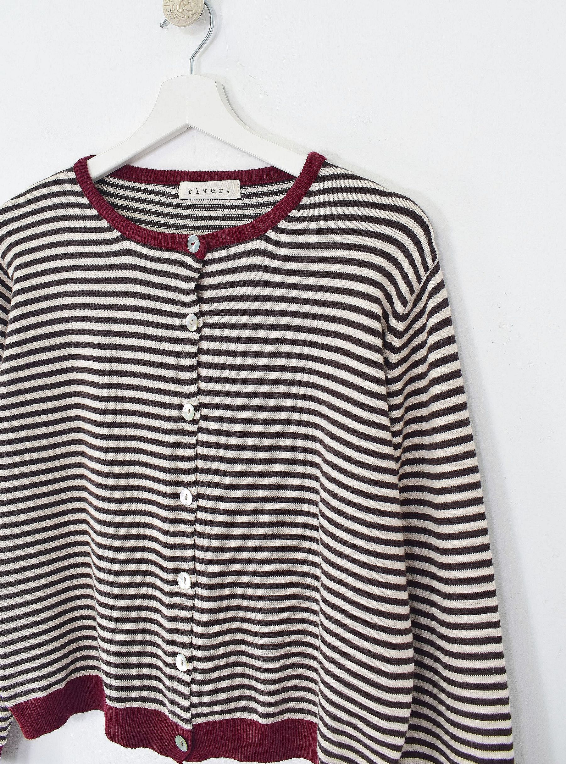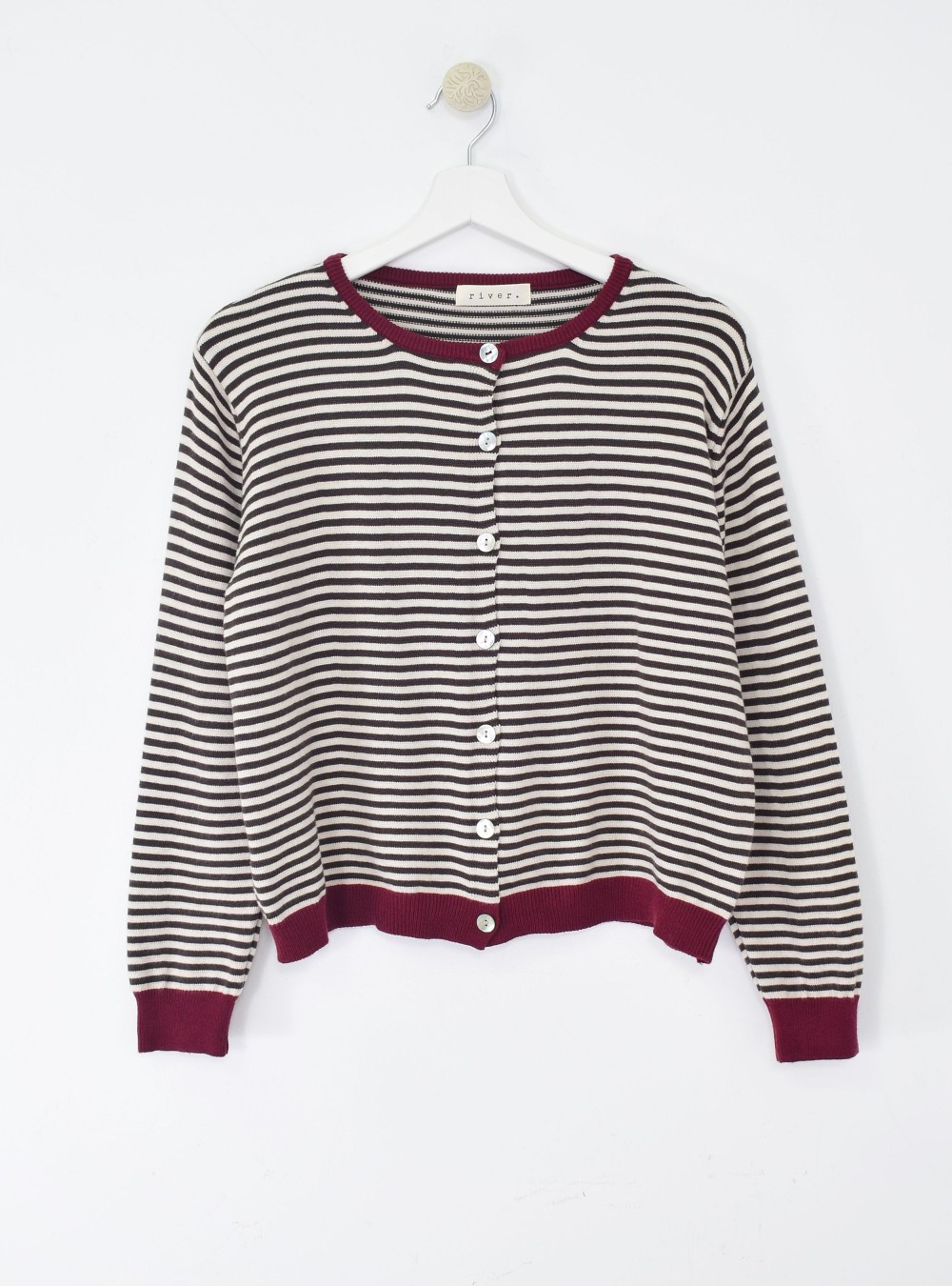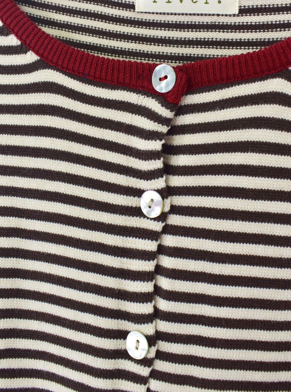 Chaqueta en punto de corte clásico con cierre por botones de nácar y rayas de color marrón. Cuello redondo. Puños, cuello y bajo rematados en color granate. Tejido muy suave. Es una prenda versátil con los colores de la temporada ideal como fondo de armario.