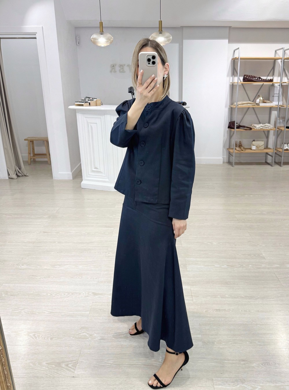 Chaqueta corta con las mangas abullonadas. Cuello redondo. Botones forrados del mismo tejido. Puedes mezclarla con la falda a juego para un total look increíble para tus eventos de primavera.
