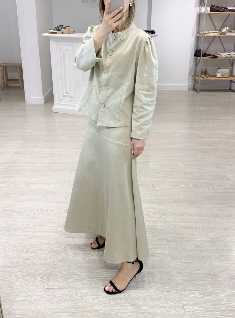 Chaqueta corta con las mangas abullonadas. Cuello redondo. Botones forrados del mismo tejido. Puedes mezclarla con la falda a juego para un total look increíble para tus eventos de primavera.