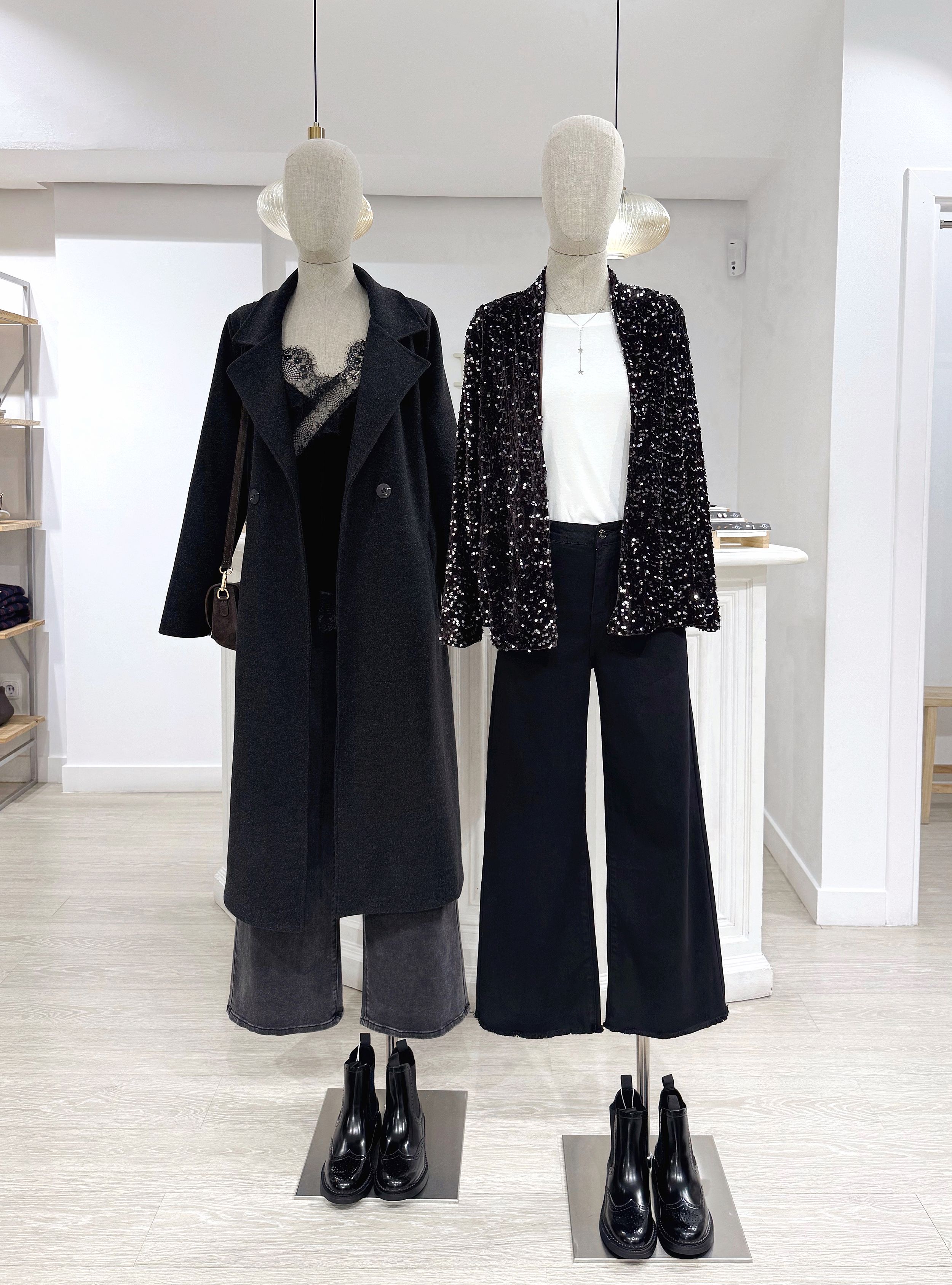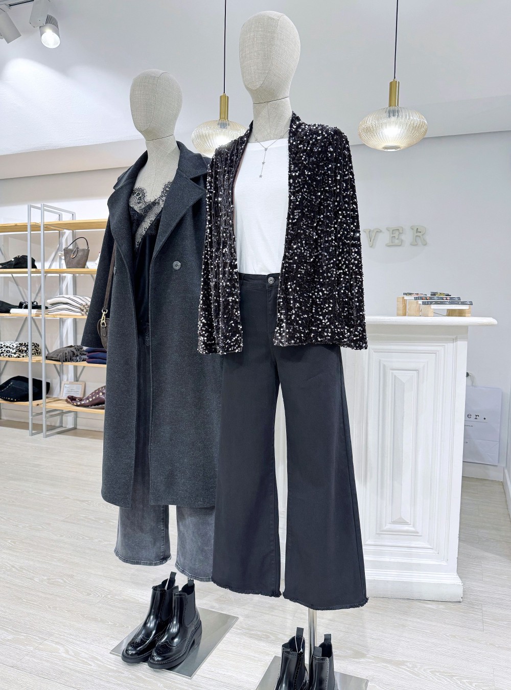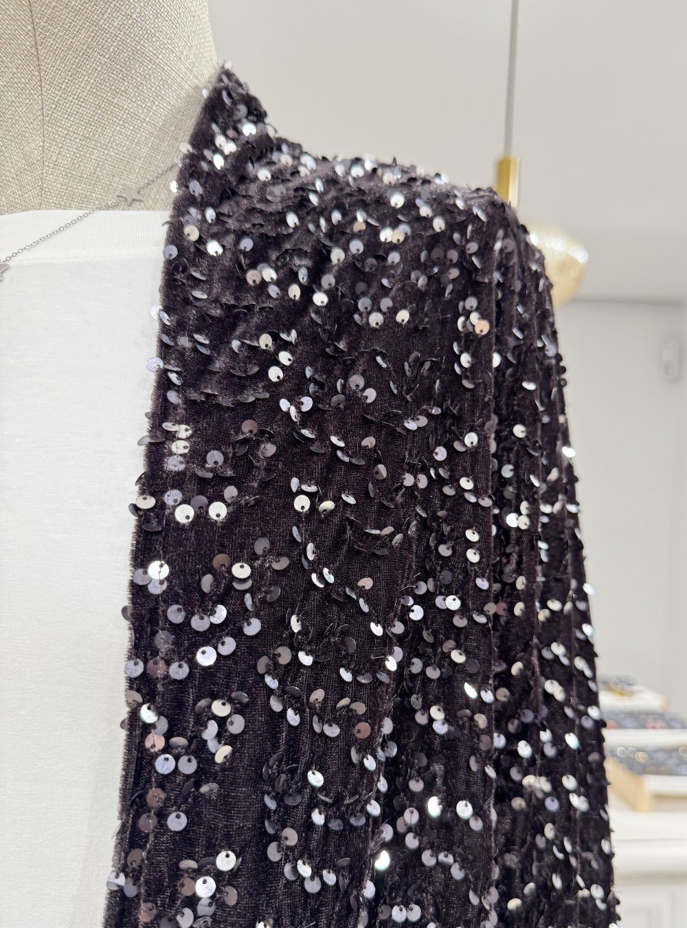 Chaqueta de terciopelo con lentejuelas en contraste. Tejido con movimiento. Puedes mezclarla con una camiseta básica de algodón, unos jeans y unos botines especiales para un look de fiesta pero confort.