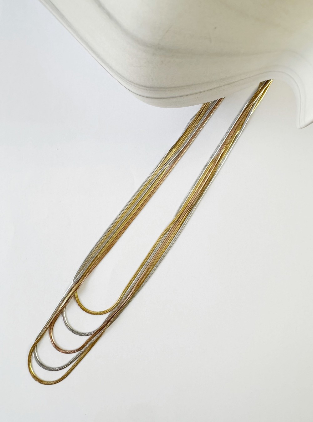 Collar con cinco tiras metálicas finas en dorado, cobre y plata.