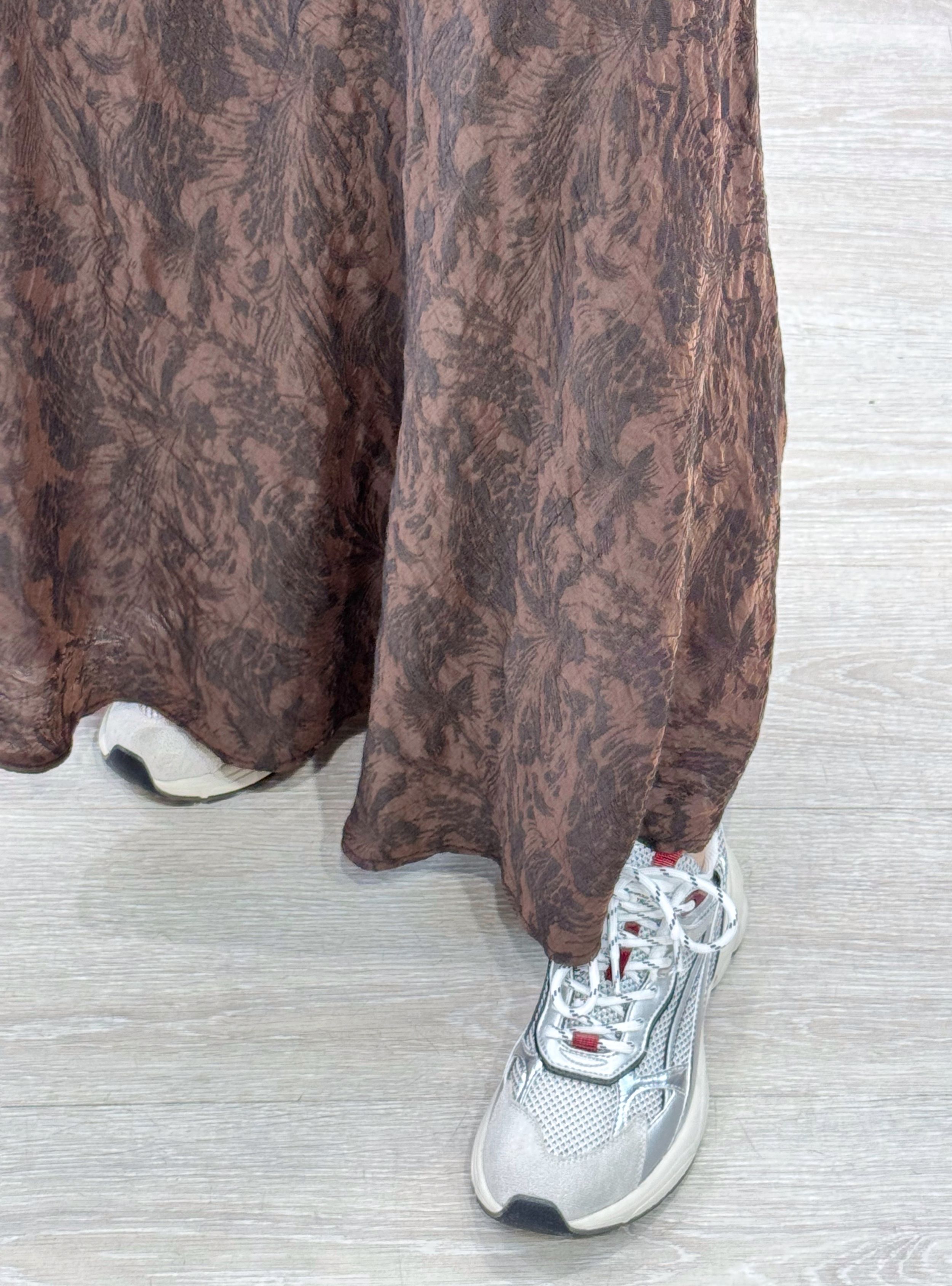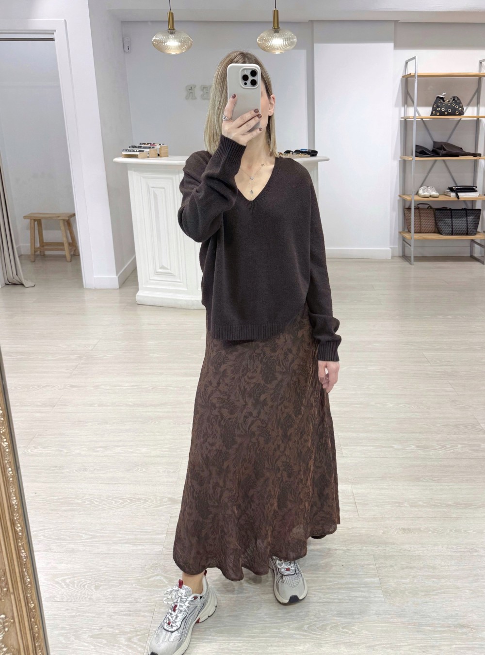 Falda larga fluida con estampado floral. Cintura elástica. Tejido con mucho movimiento. Puedes mezclarla con un jersey de punto de corte holgado para un look sencillo que siempre funciona bien.