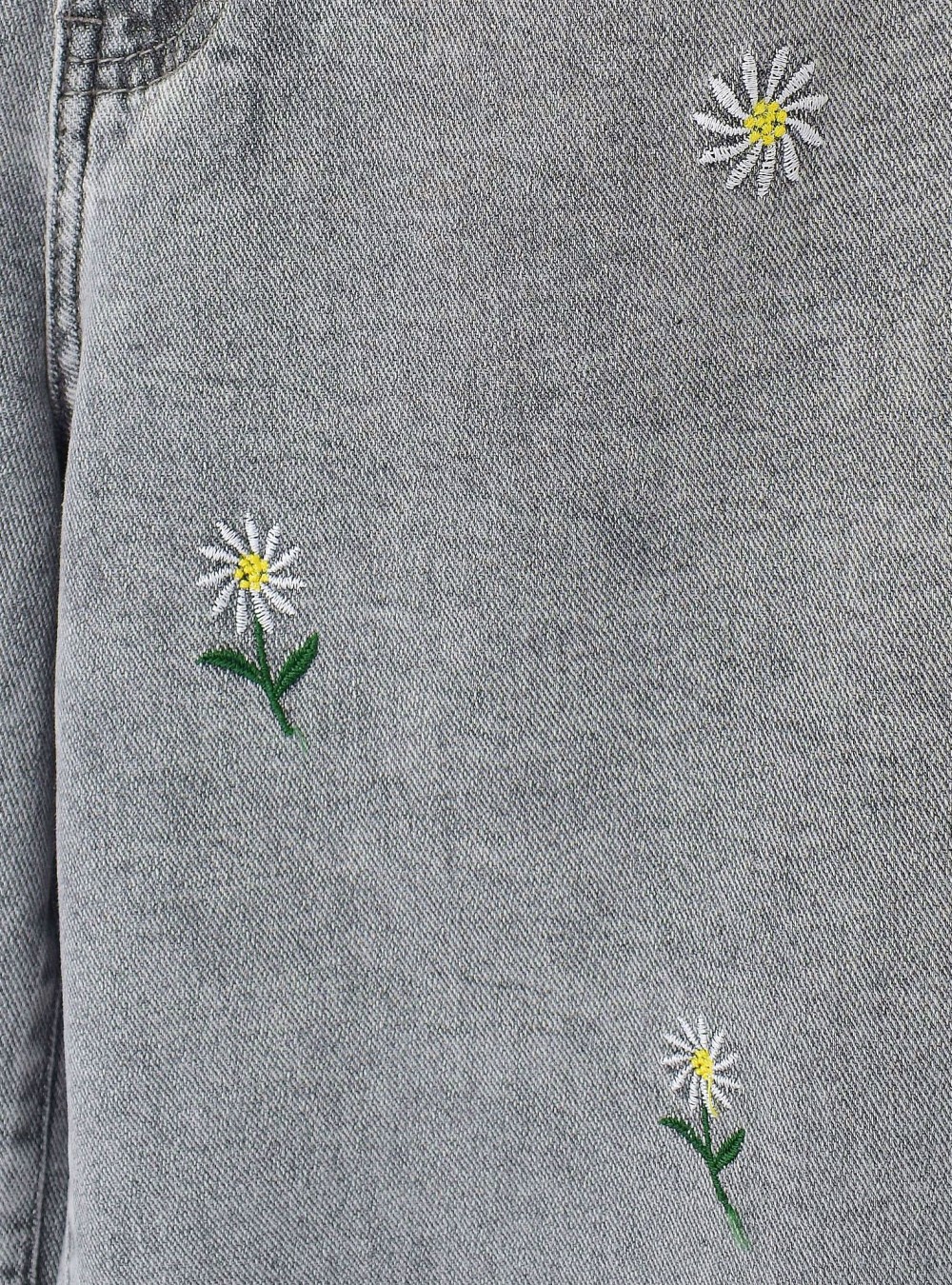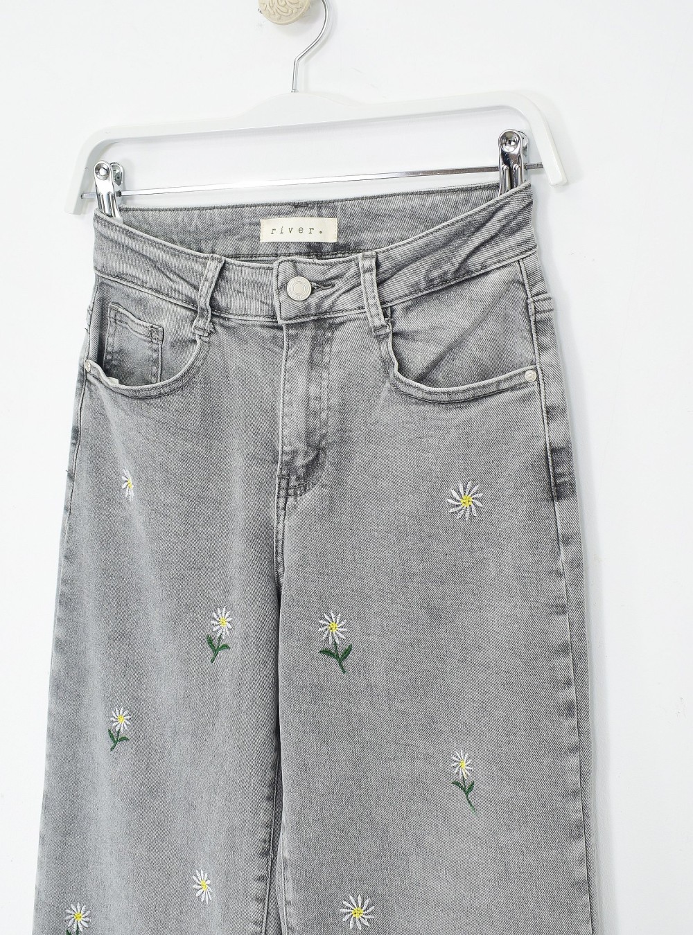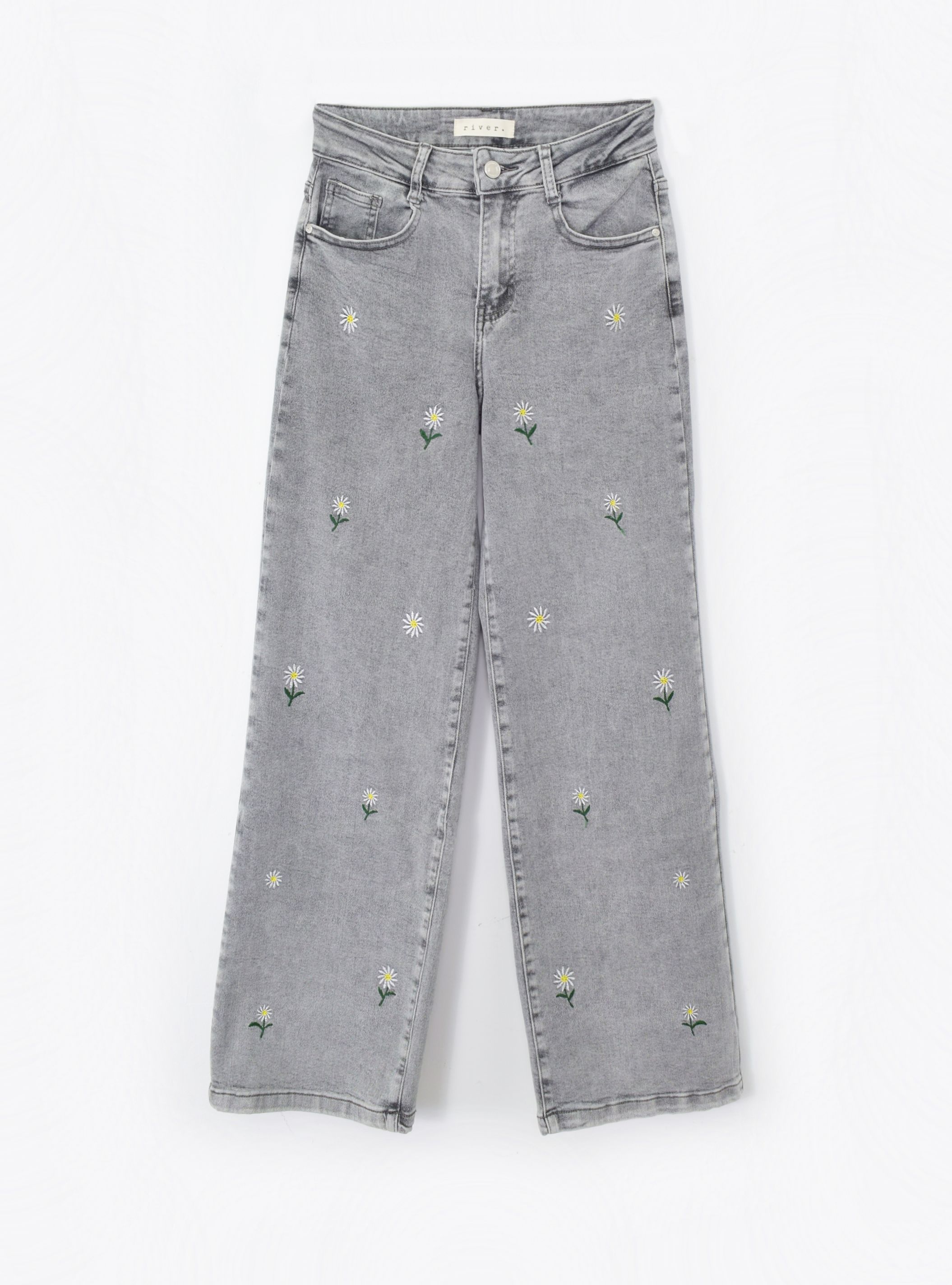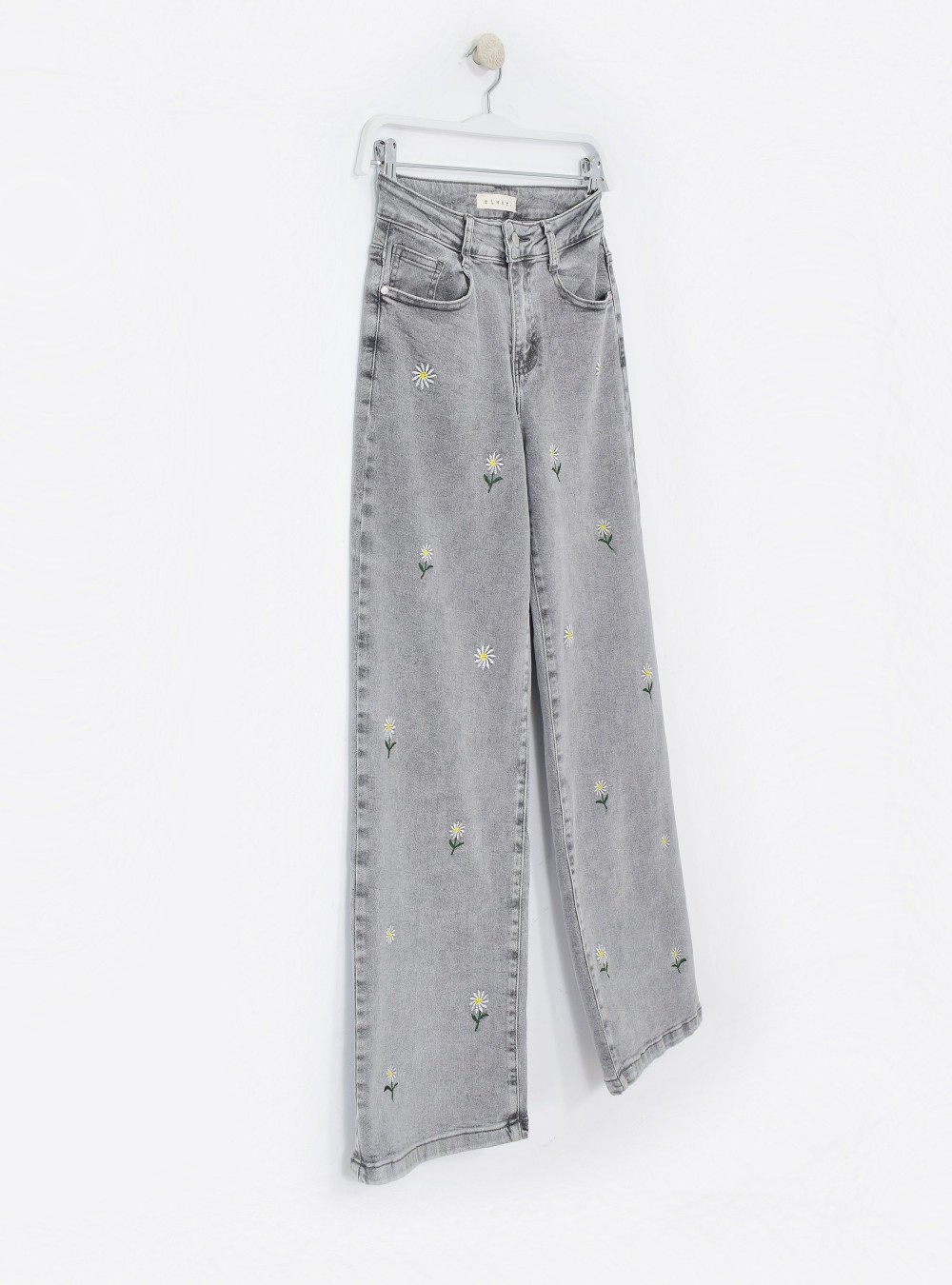 Jeans straight en tejido súper suave, con mucha caída y ligeramente elástico. Margaritas bordadas por delante y lavado ácido en la tela. Combínalo con partes de arriba lisas o con pequeños detalles para que el jeans pueda ocupar la posición principal en el look. Como calzado puedes utilizar colores blanco, negro, camel y chocolate.