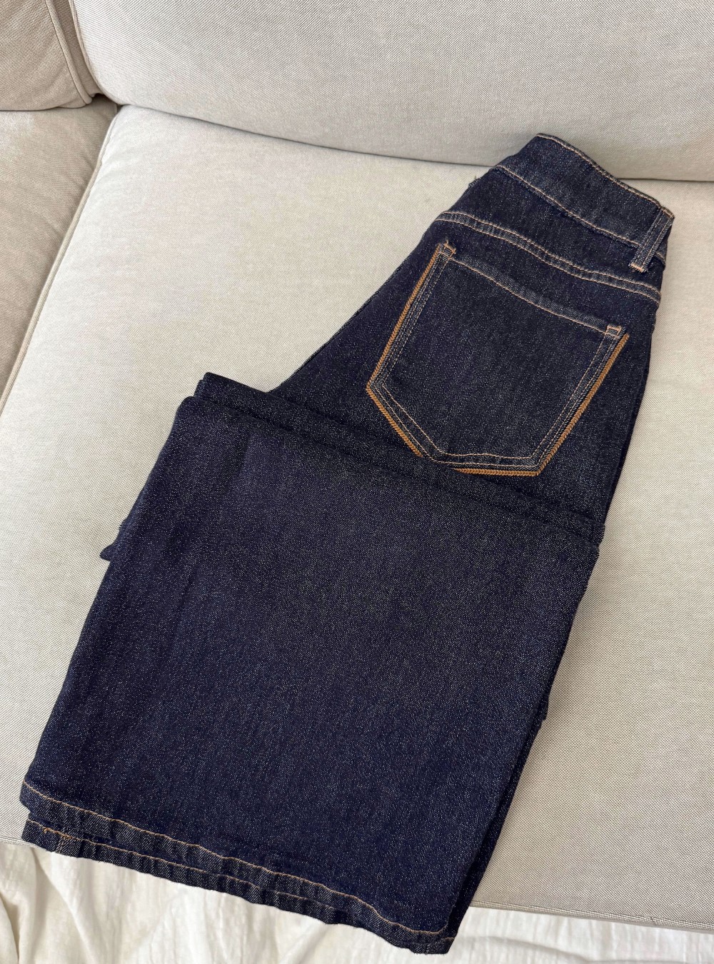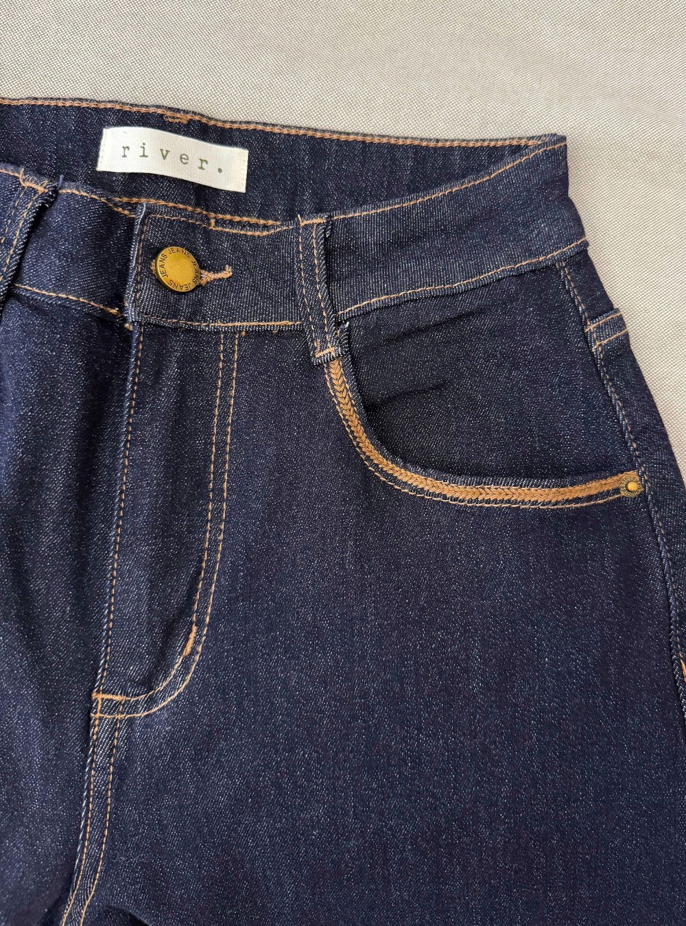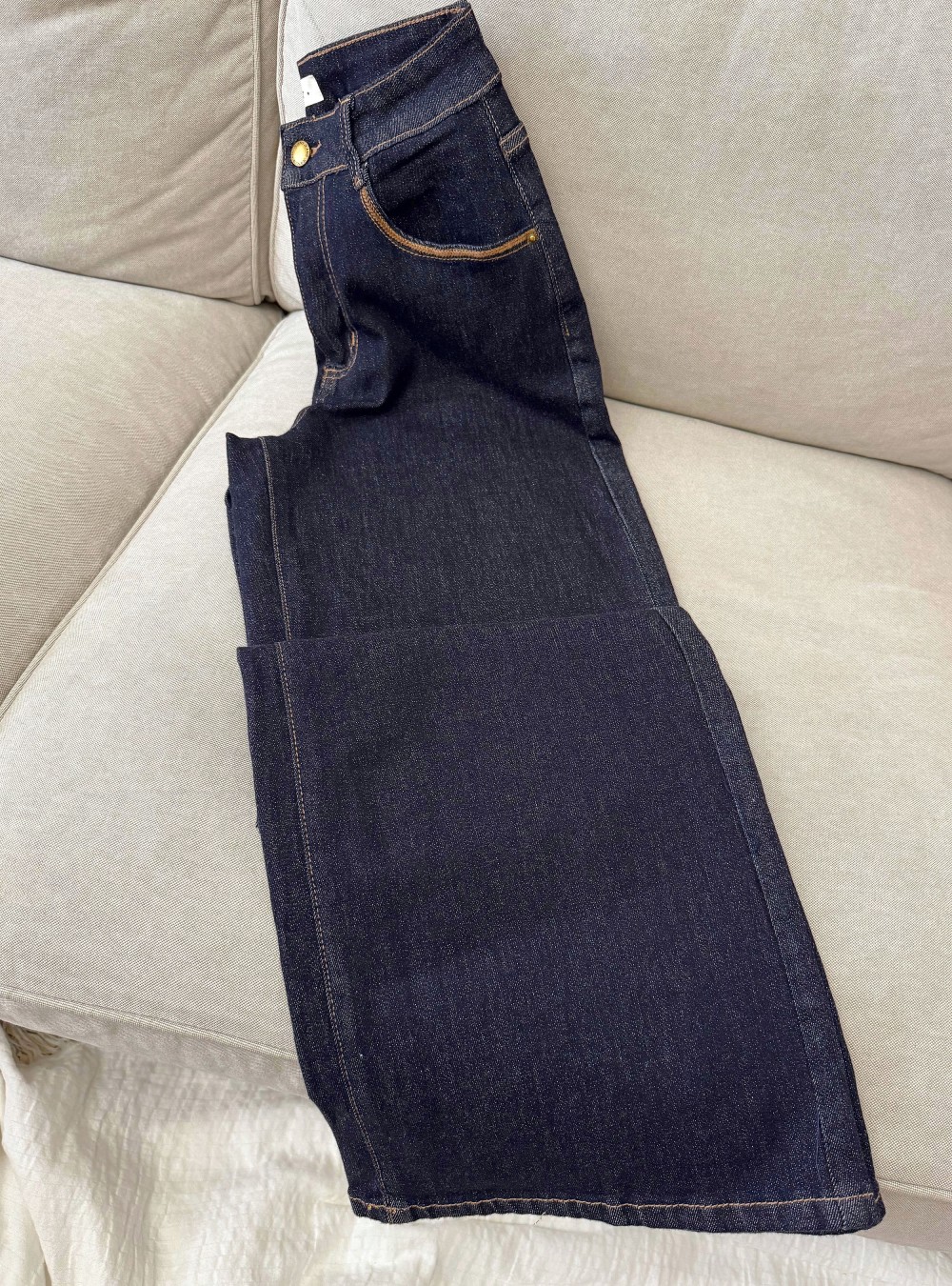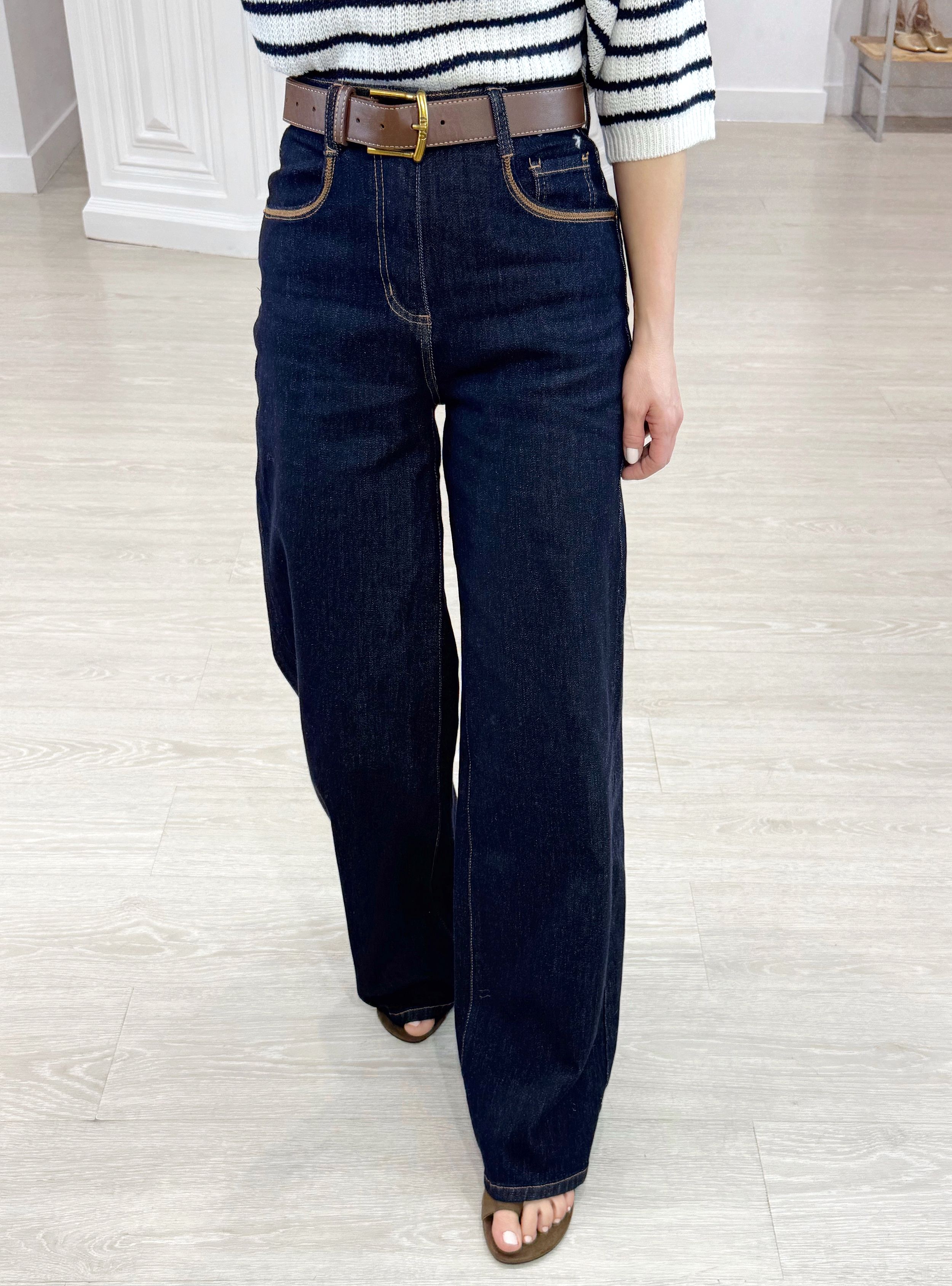 Jeans straight de tiro alto relaxed. Cinco bolsillos. Tiene un cinturón marrón. Tiene ribetes bordados en contraste en los bolsillos. Puedes mezclarla con nuestro jersey de rayas de punto calado para un look casi sin esfuerzo.