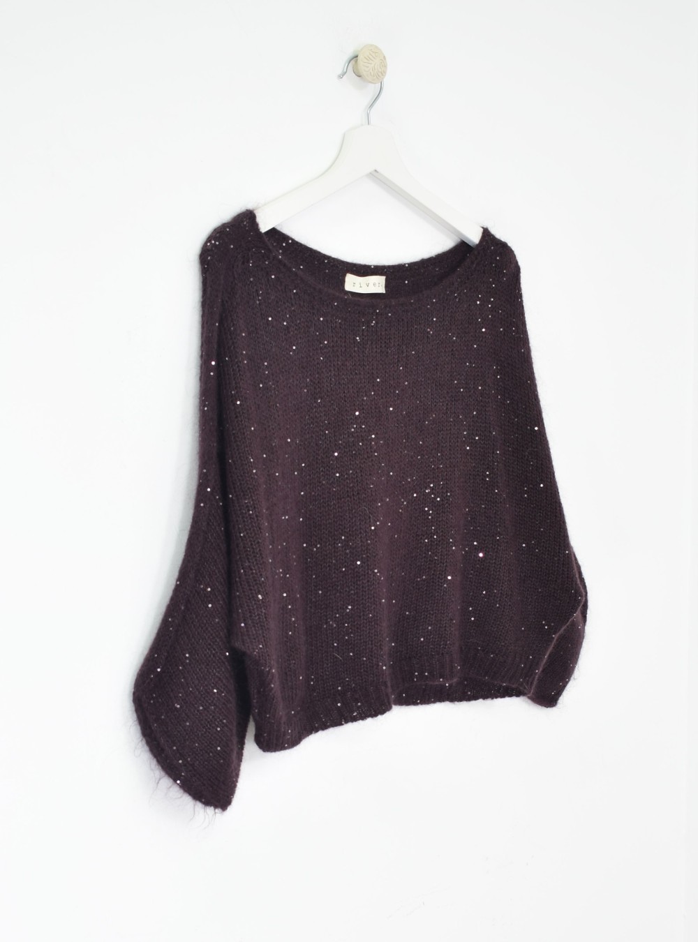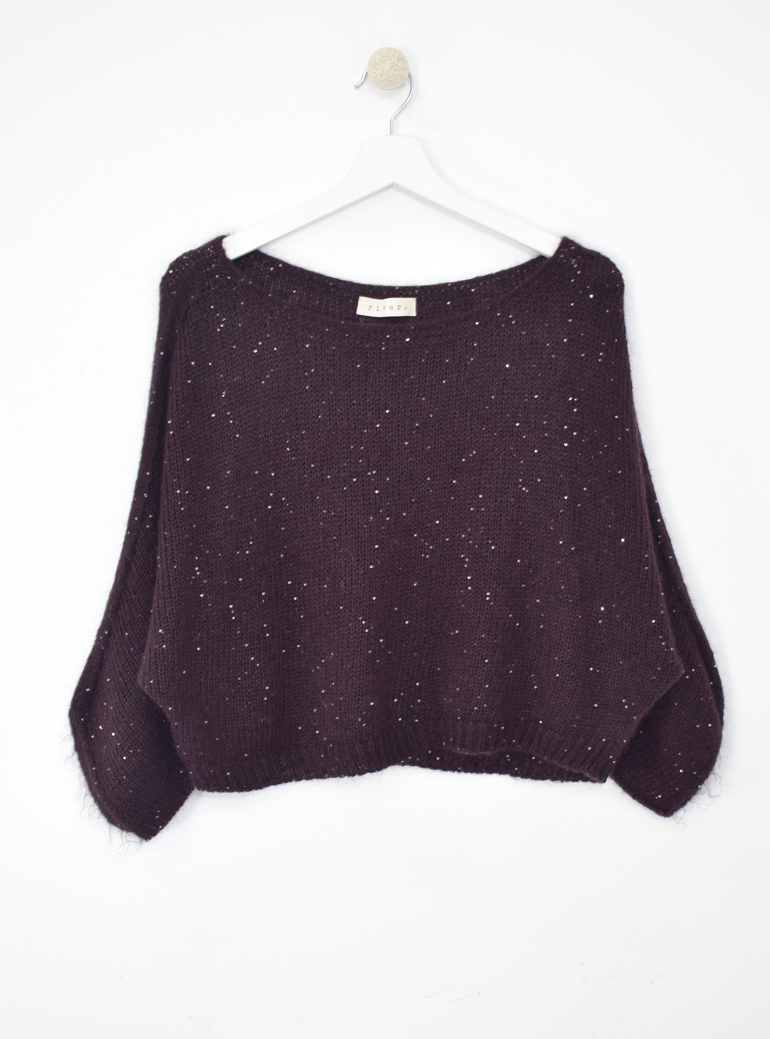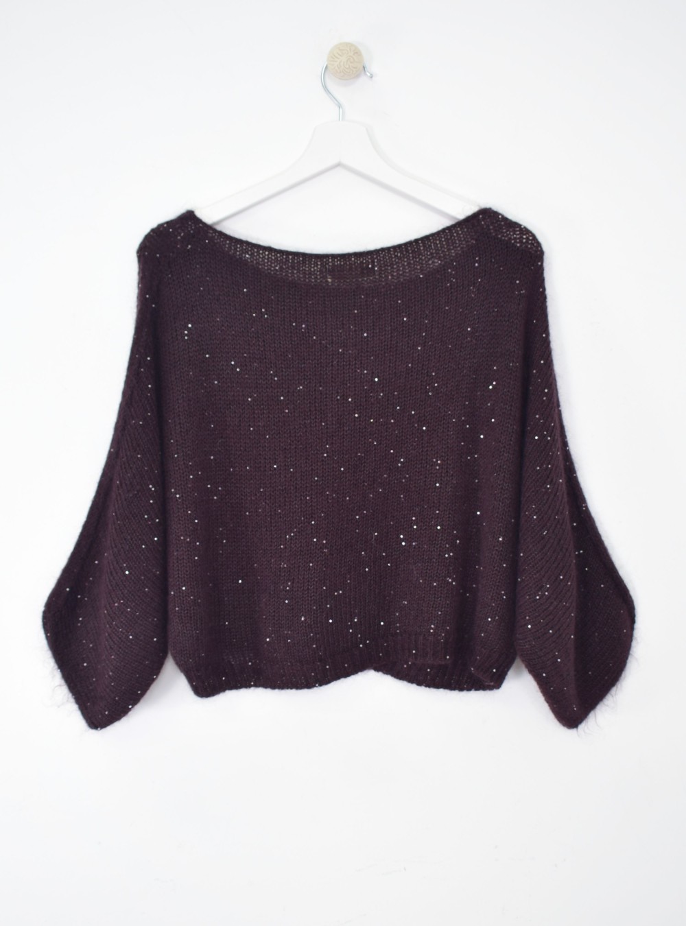 Jersey de punto con manga murciélago y jaspeado de lentejuelas del mismo tono. Tejido muy suave y corte especial que dará un toque de estilo a tus looks.