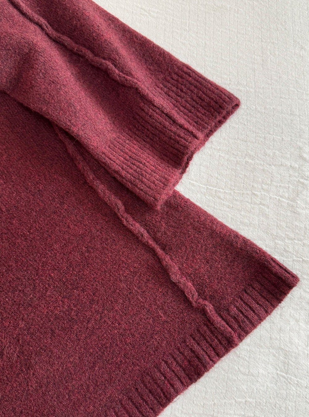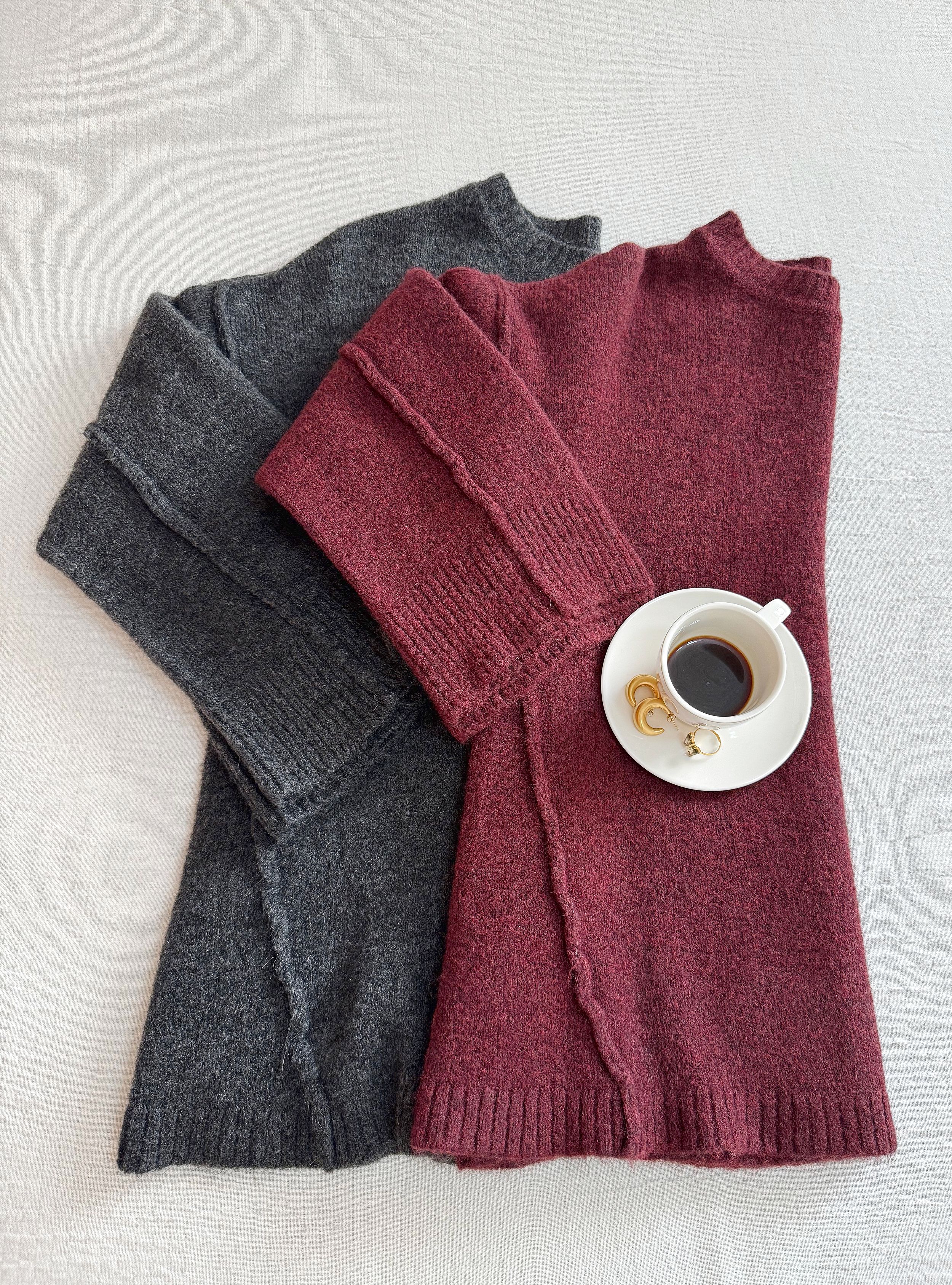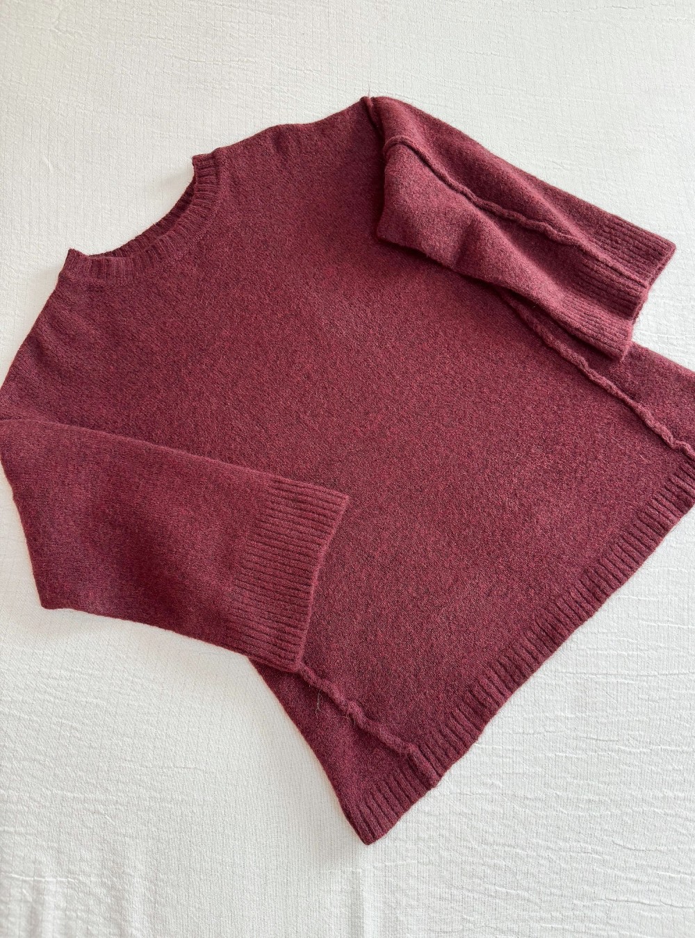 Jersey de punto con la costura vista. Cuello redondo. Tejido calentito y suave al tacto. Puedes mezclarlo con una blusa romántica, un jeans y un bolso de piel con un punto de color.
