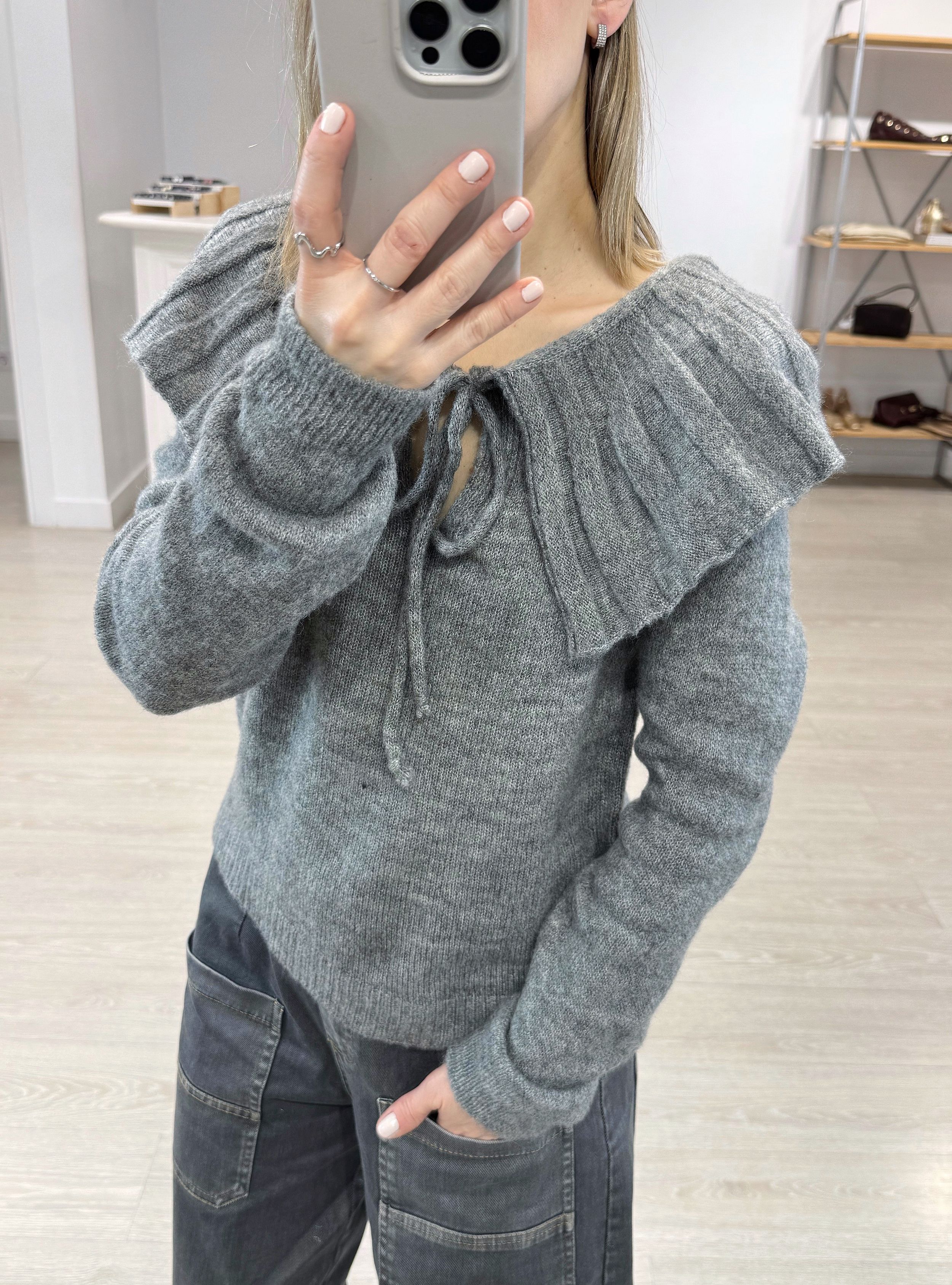 Jersey de punto de corte clásico con el cuello amplio. Cierre por medio de cordón del mismo tejido. Muy suave al tacto.