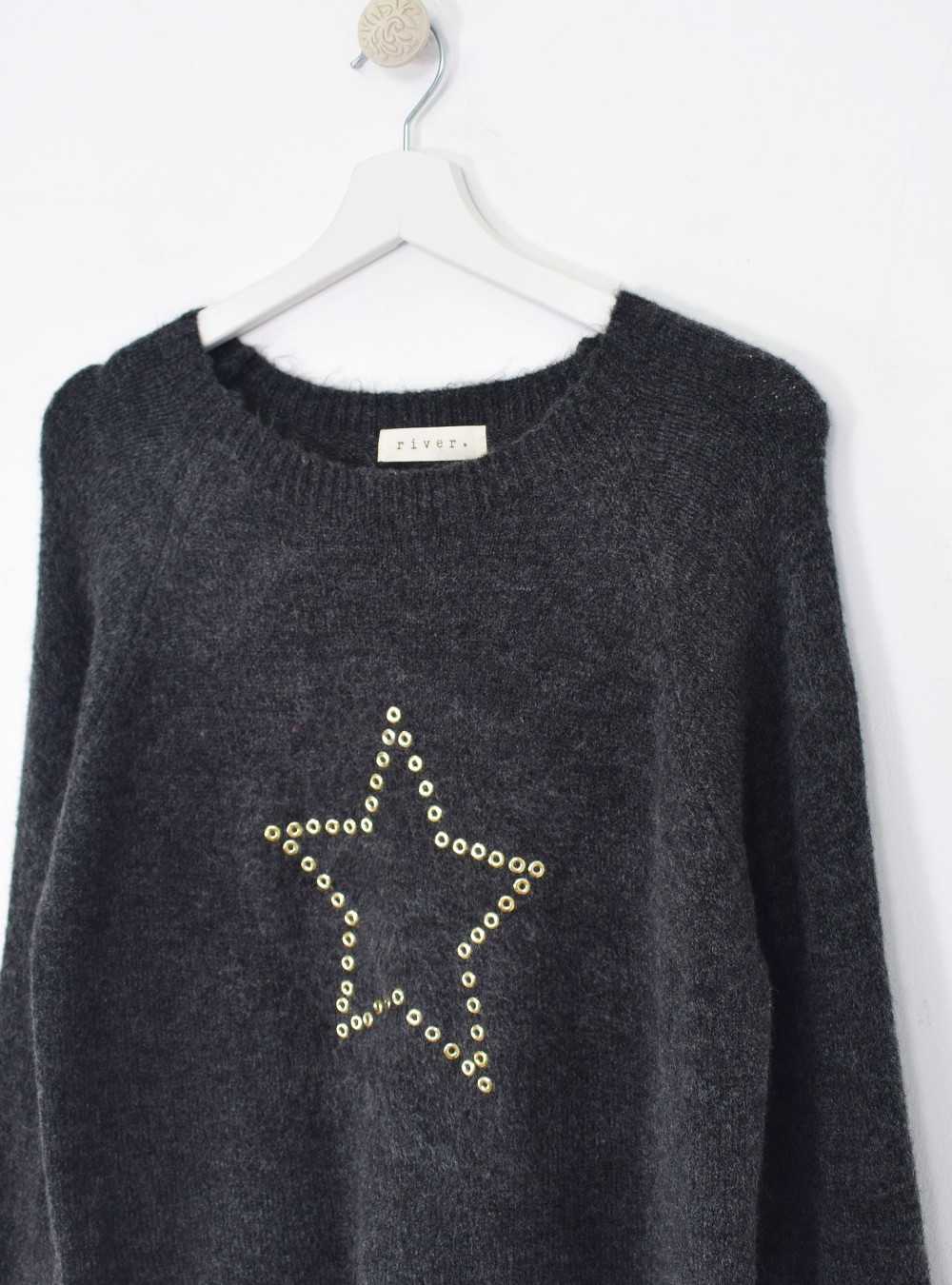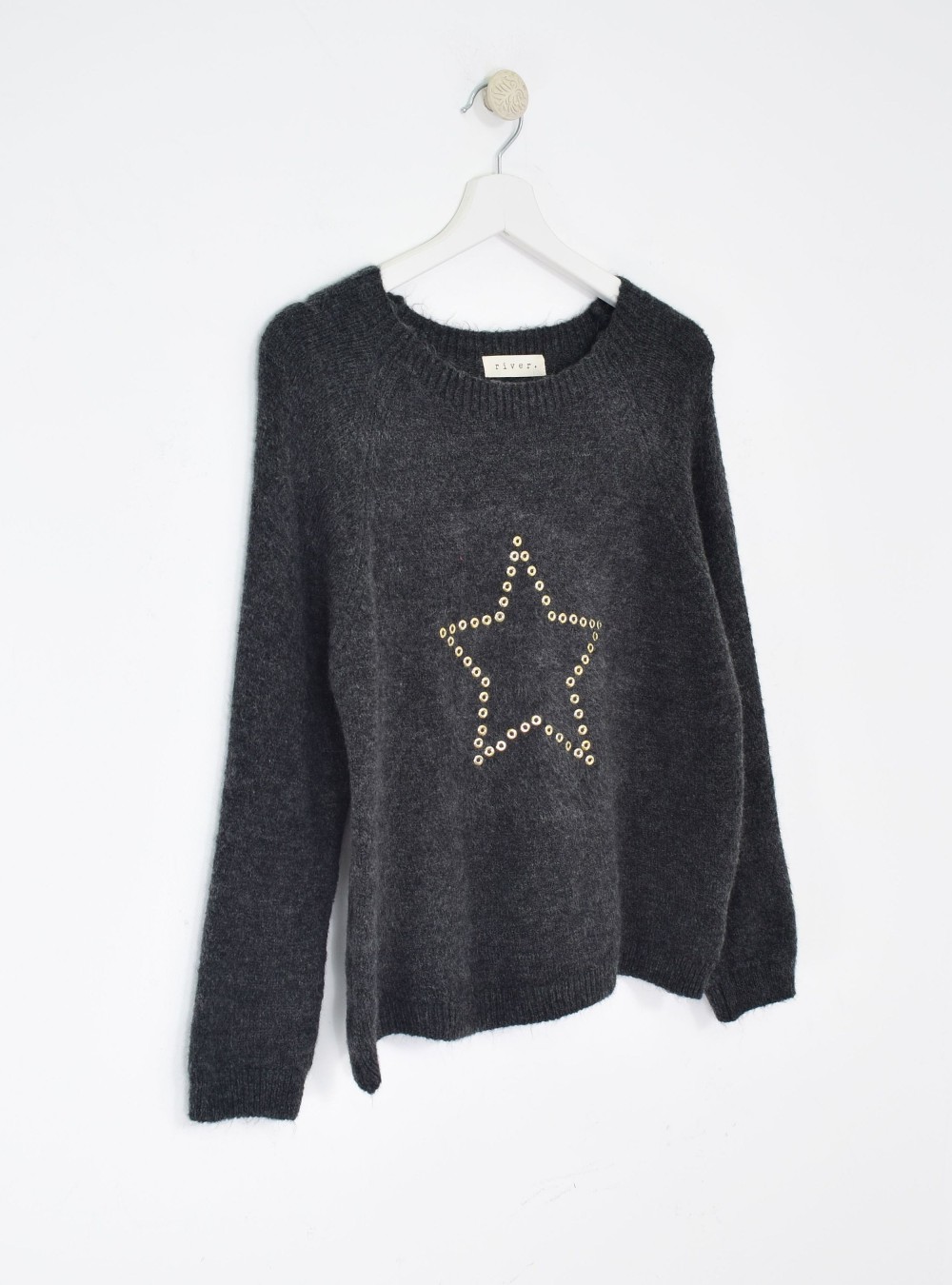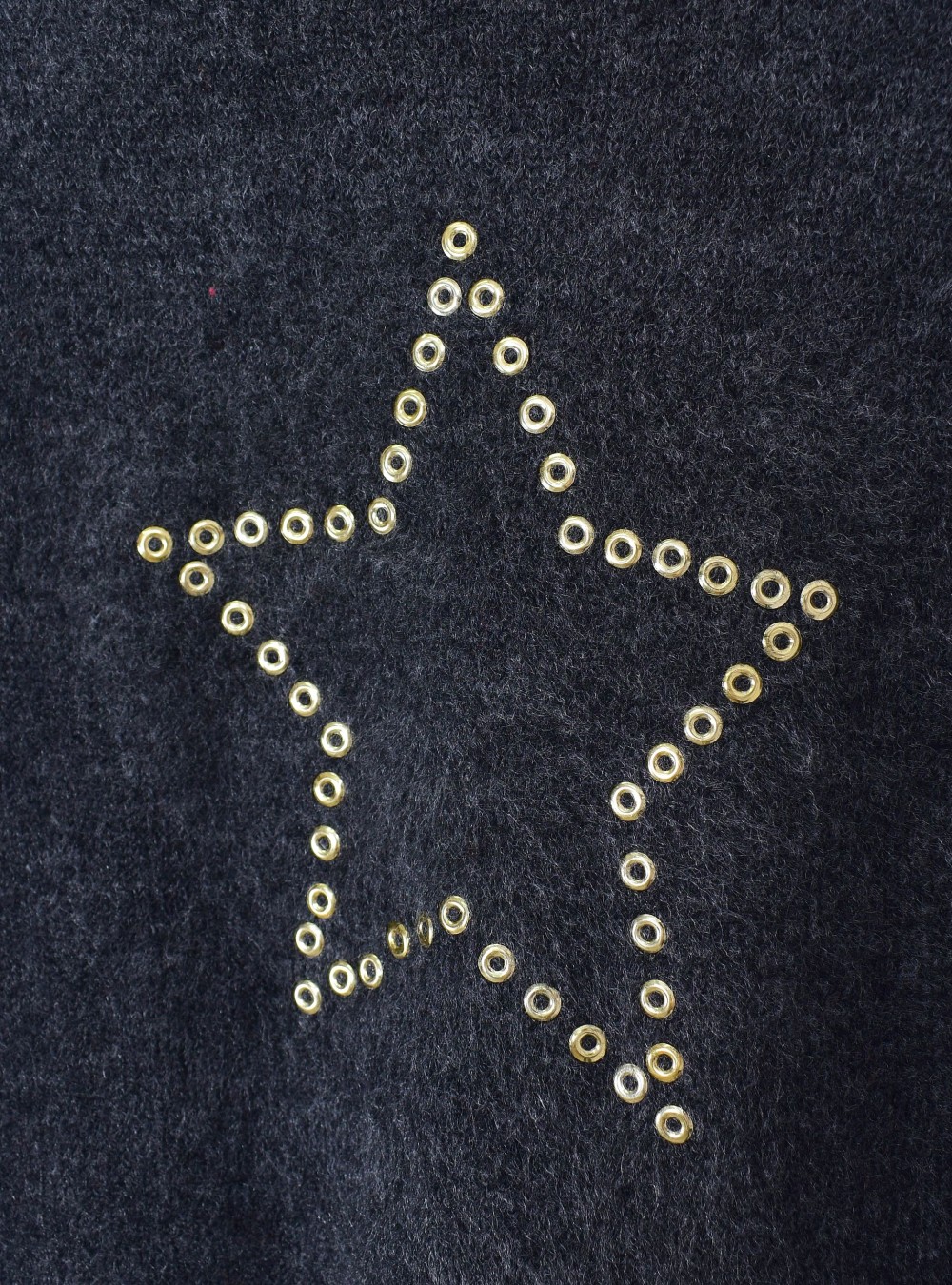 Jersey de corte recto en punto con un pequeño porcentaje de lana, cuello redondo y decorado con una estrella de tachas perforadas doradas por delante. Tejido muy suave. Perfecto para acompañar a partes de abajo lisas y blusas y camisas no muy recargadas.