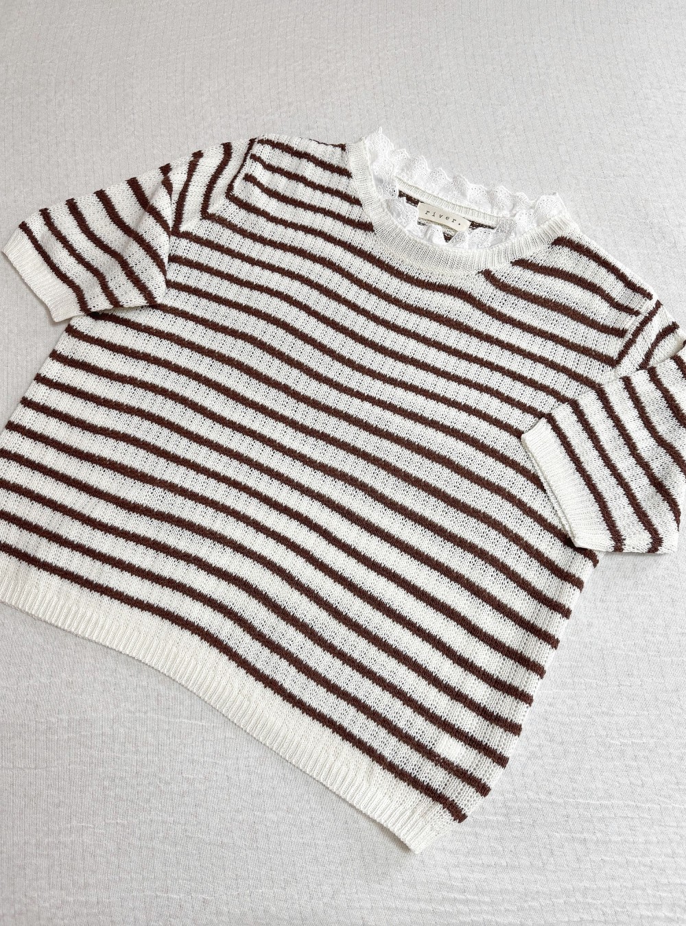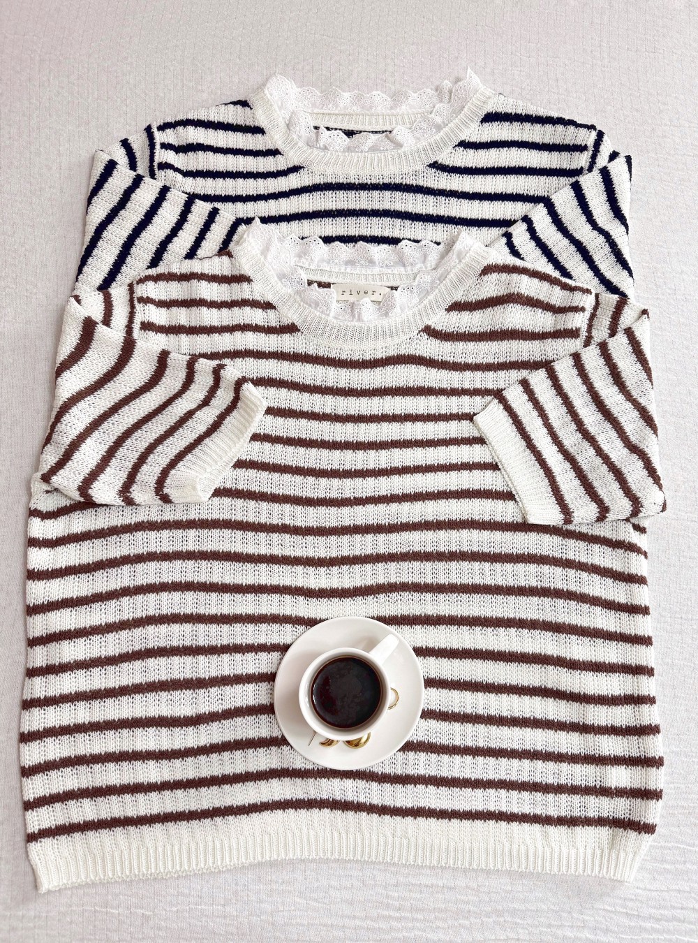 Jersey de punto calado de corte holgado con rayas. Cuello redondo con banda bordada. Manga corta. Puedes mezclarlo con un jeans y unas sandalias de tacón para un look casual de día pero con mucho estilo.