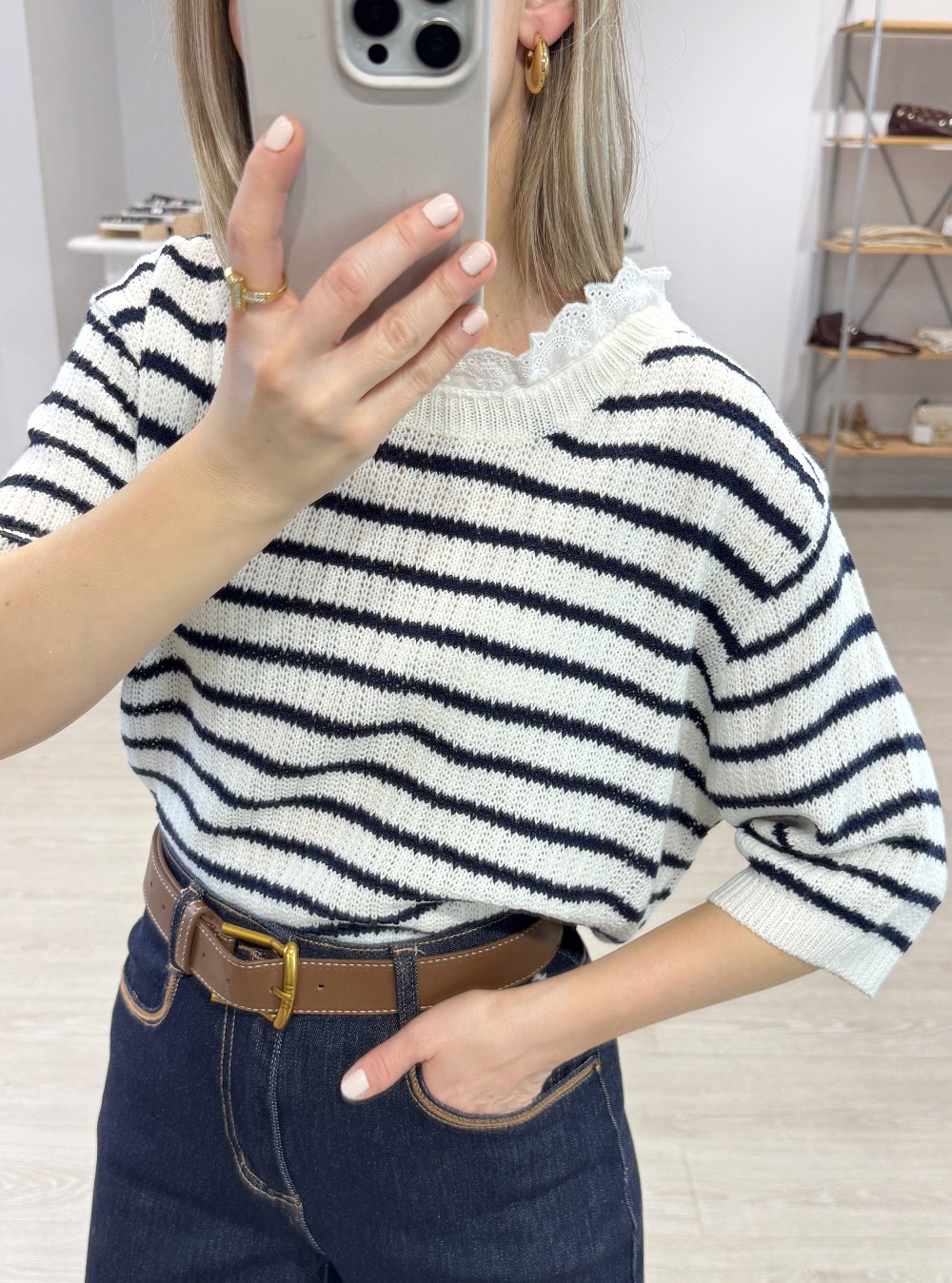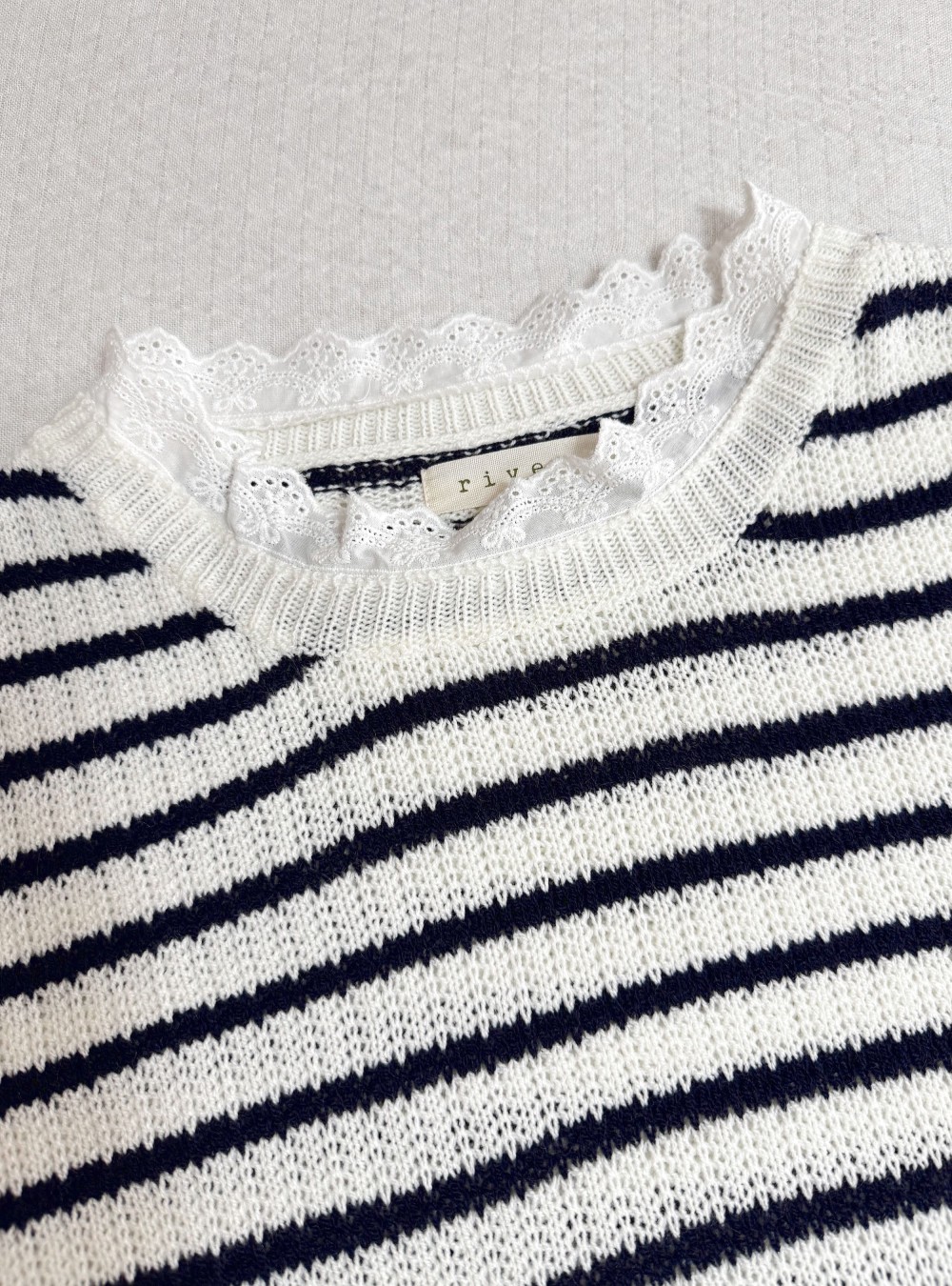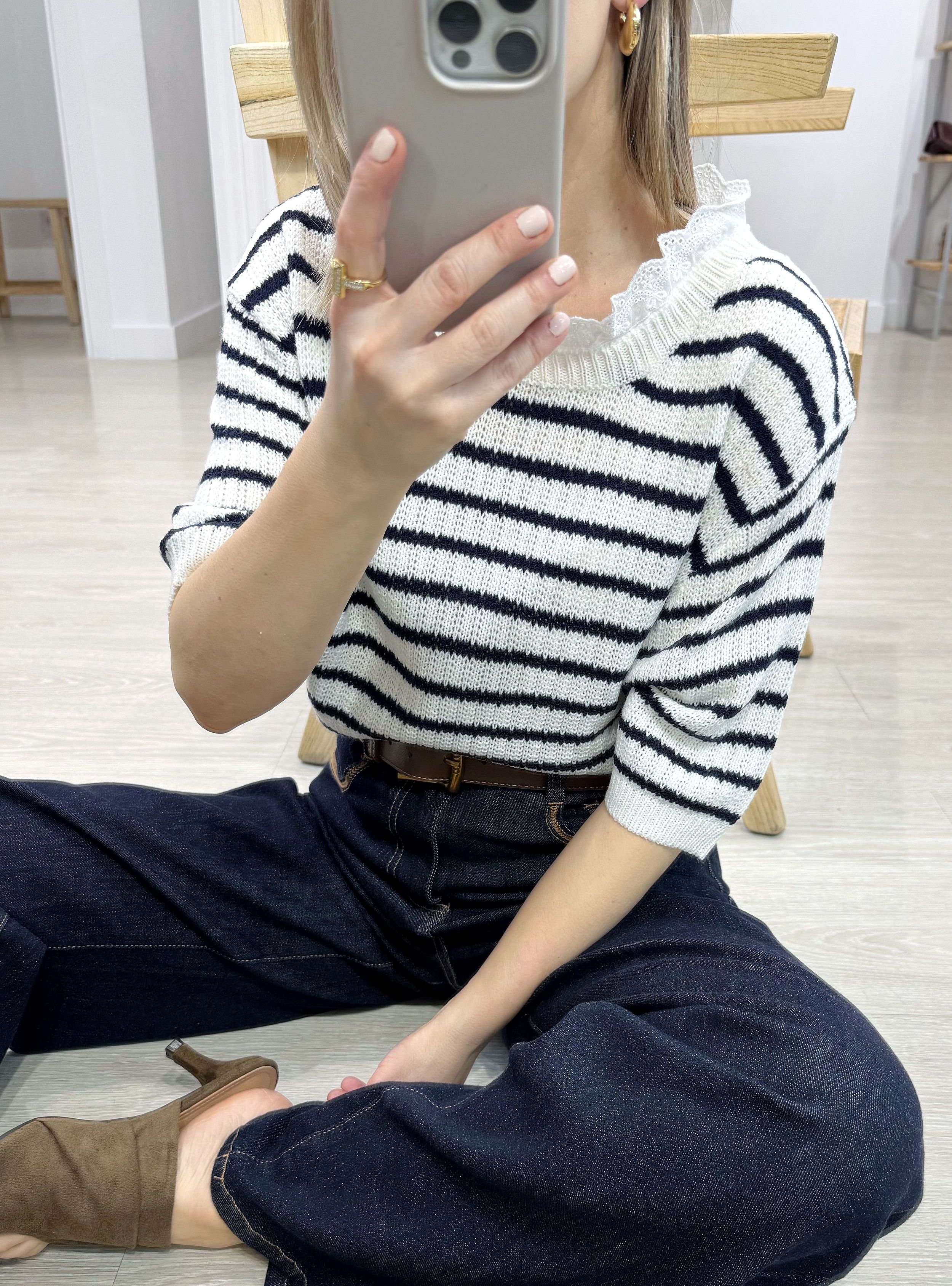 Jersey de punto calado de corte holgado con rayas. Cuello redondo con banda bordada. Manga corta. Puedes mezclarlo con un jeans y unas sandalias de tacón para un look casual de día pero con mucho estilo.