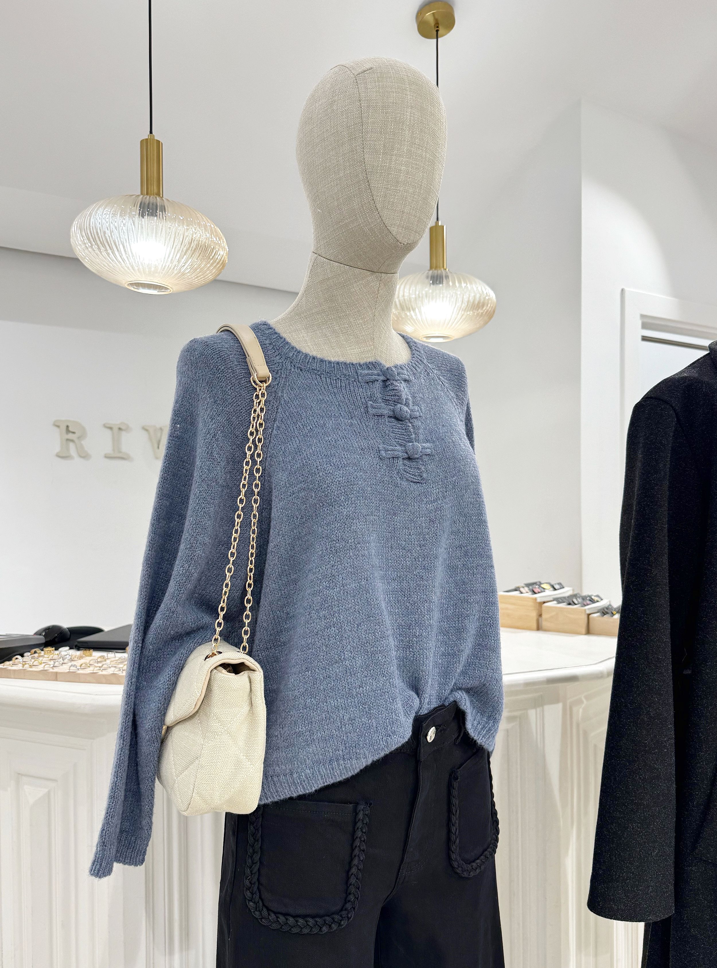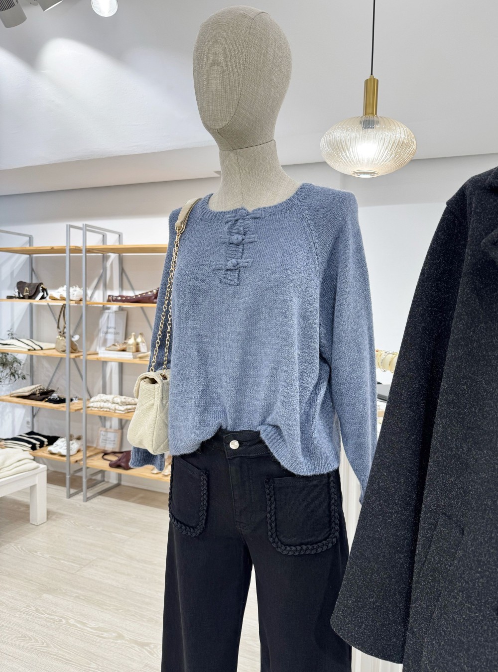 Jersey de punto de corte holgado con botones forrados del mismo tejido. Cuello redondo. Corte holgado. Puedes mezclarlo con un jeans de tiro alto y unas zapatillas para un look fresco de día.