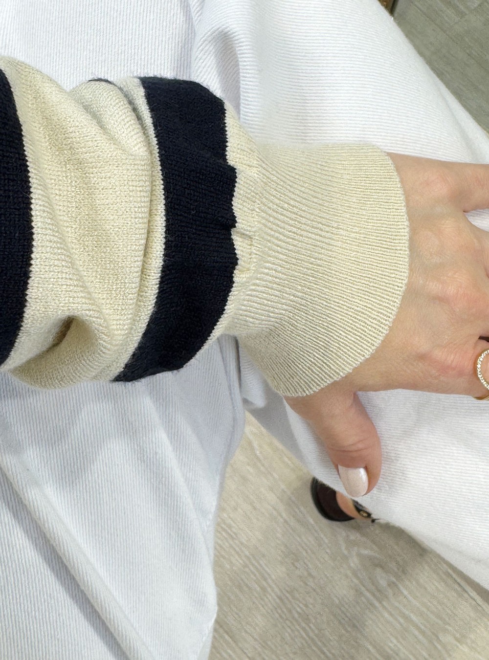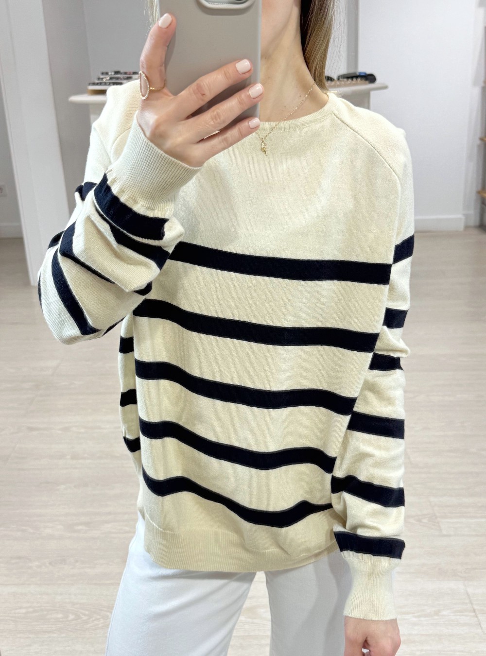 Jersey de punto fino con rayas en color negro en tejido de cashmere. Cuello redondo. Aberturas en los laterales. Corte holgado. Tejido ultra suave y con mucho movimiento.