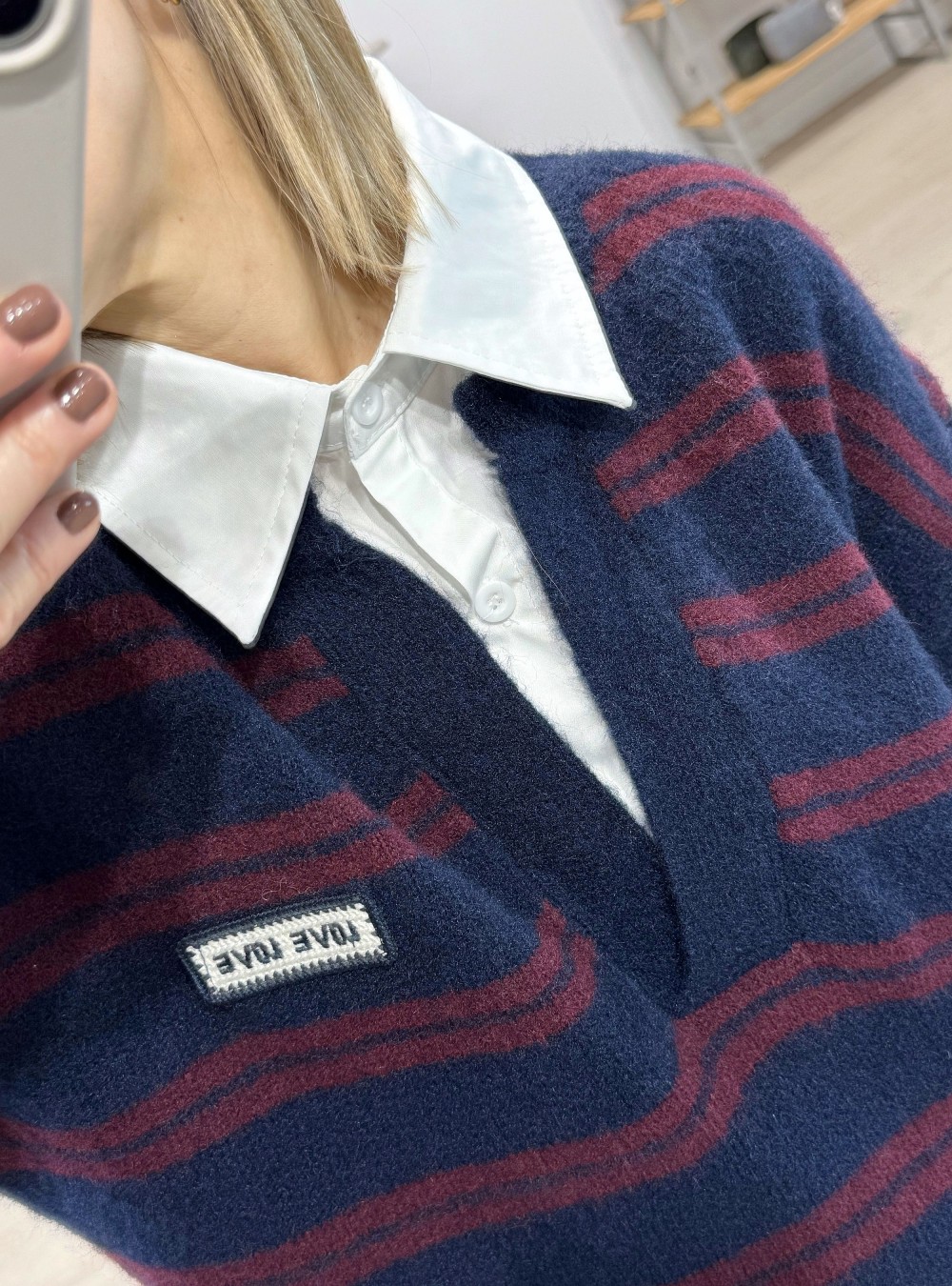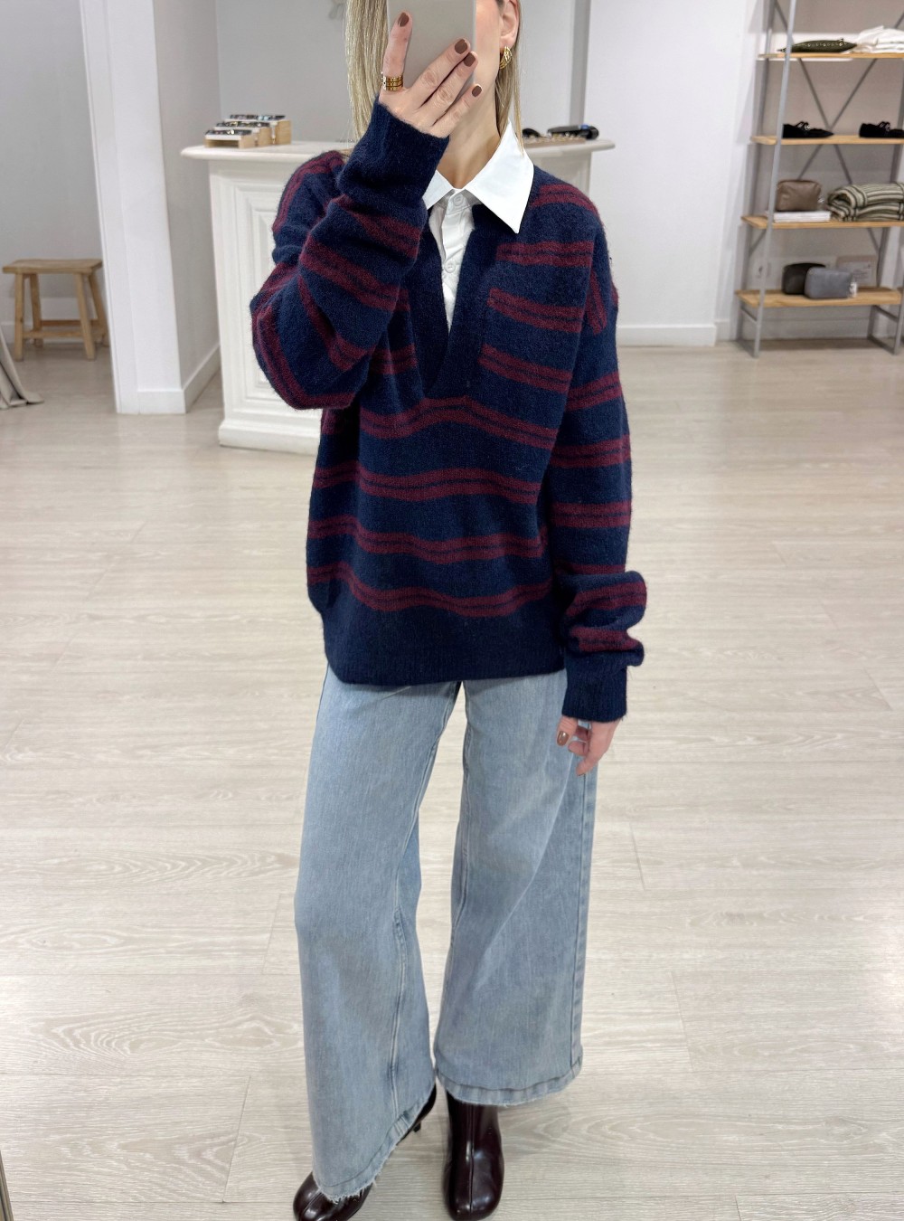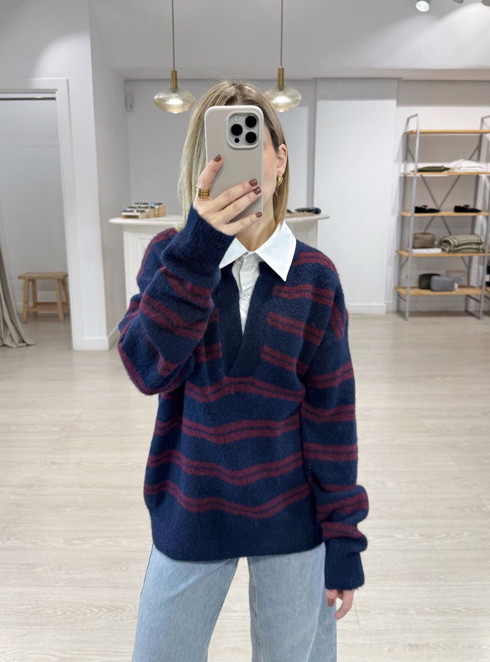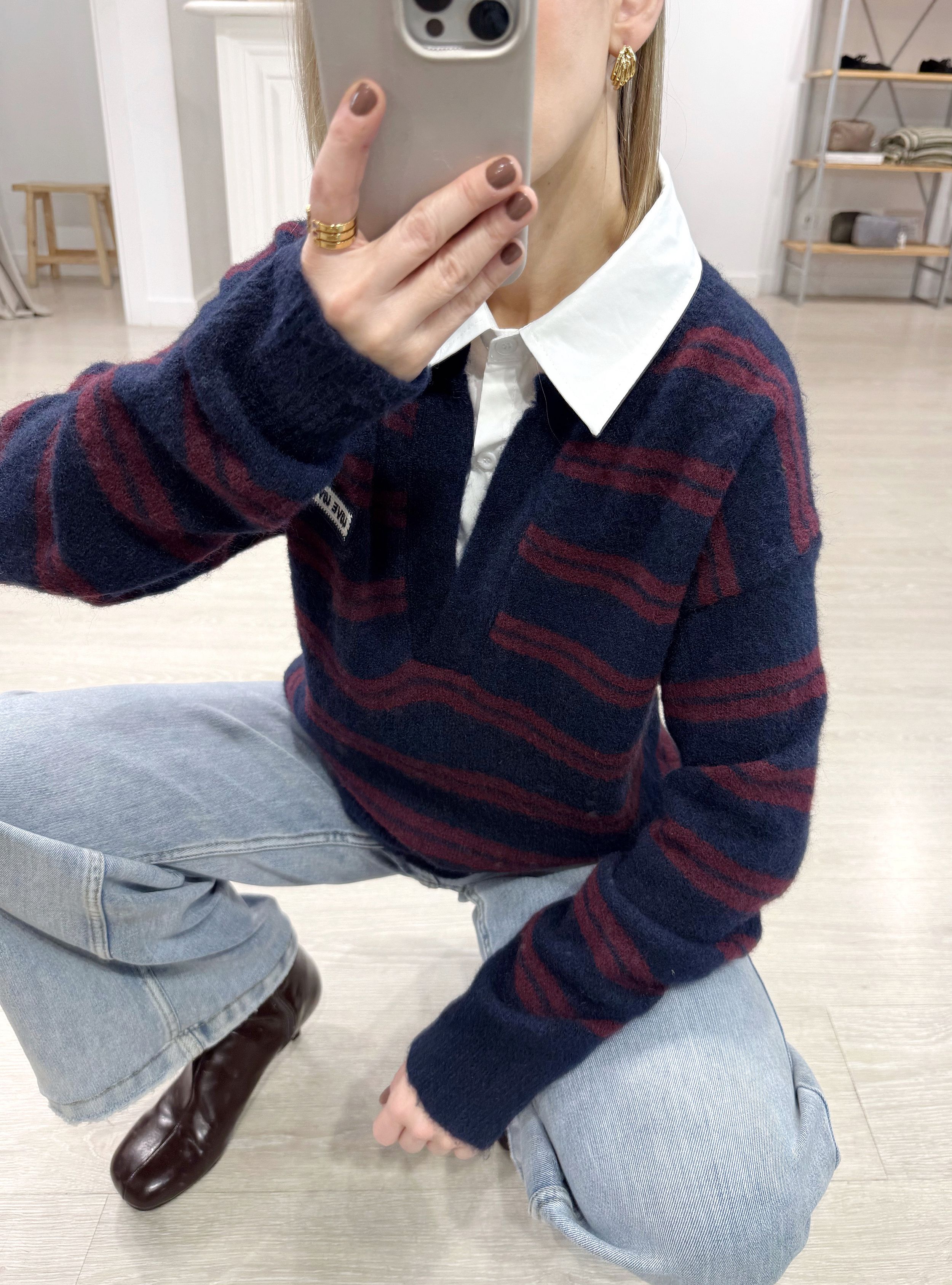 Jersey de punto con rayas con cuello de camisa en contraste combinado. Corte amplio. Tejido muy suave al tacto. Puedes mezclarlo con tu jeans favorito y un abrigo de paño de corte oversize para un estilo súper actual.