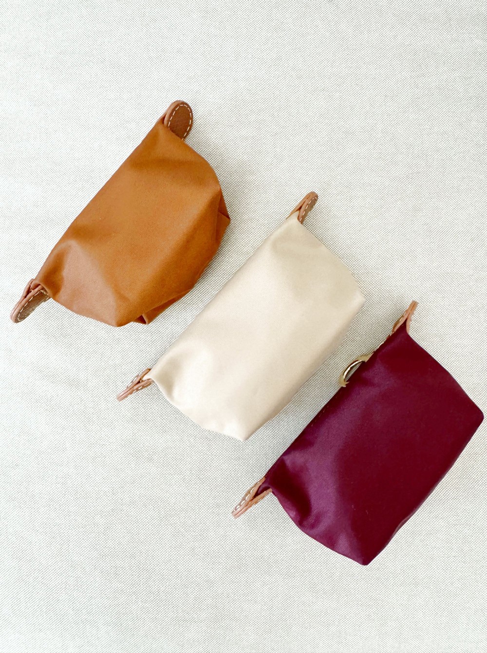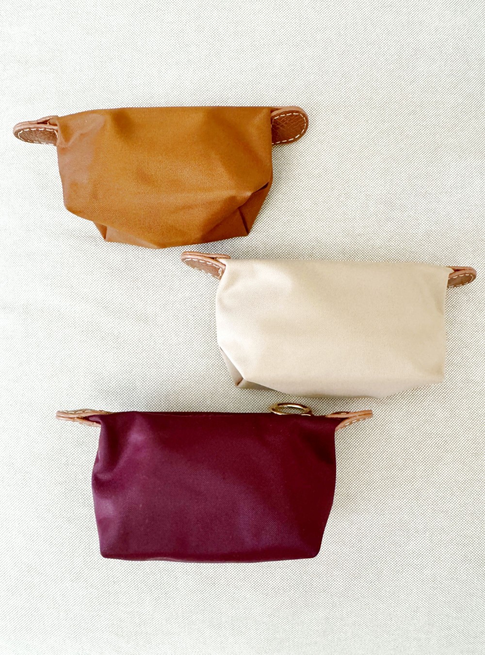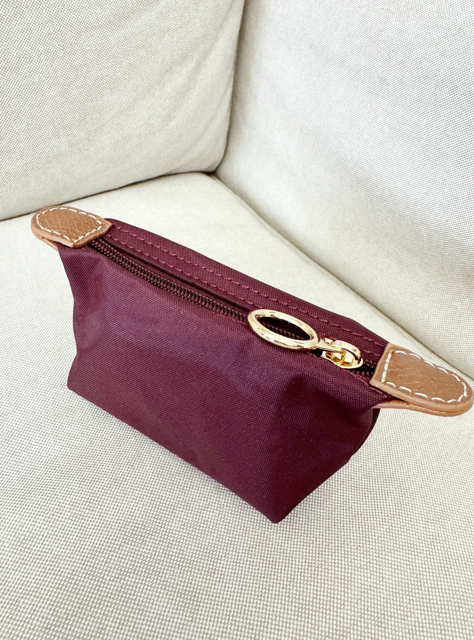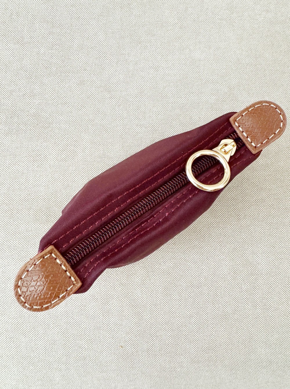 Monedero con cierre por cremallera remata en ambos extremos con piezas de PU de color camel.