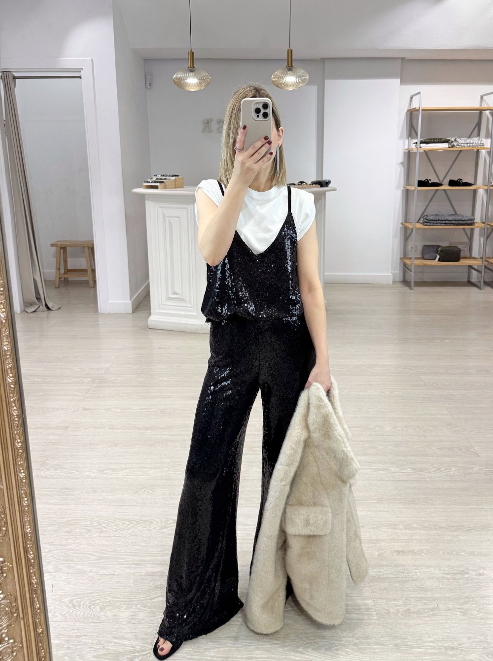 Pantalón tipo palazzo de lentejuelas. Cintura elástica. Tiene forro. Puedes mezclarlo con el top a juego para un look con mucho rollo.