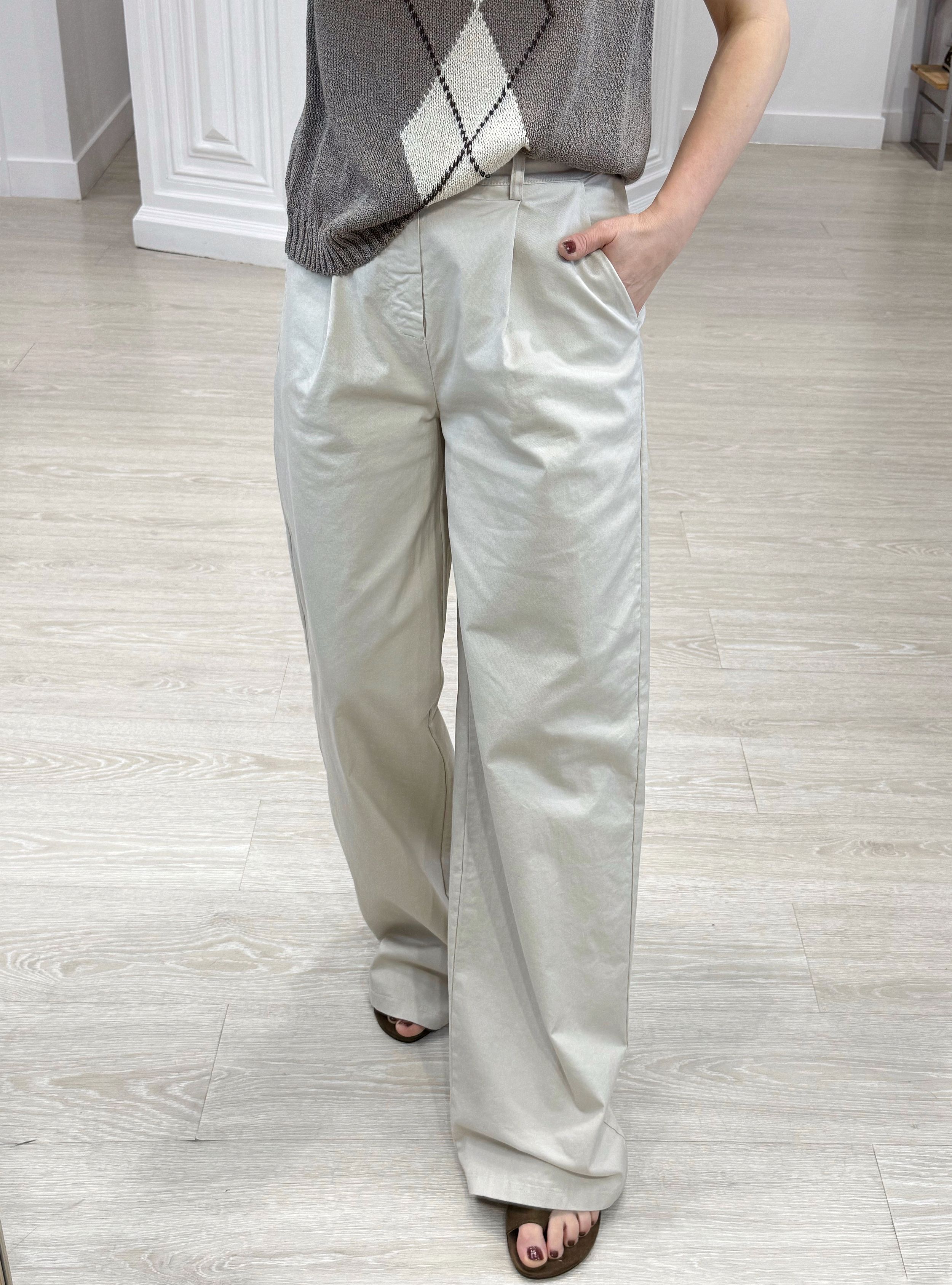 Pantalón tipo chino en tejido de algodón. Cintura elástica. Dos bolsillos. Cierre por medio de botón y cremallera. Puedes mezclarlo con un chaleco de punto con rombos de la misma gama de color para un look de día.