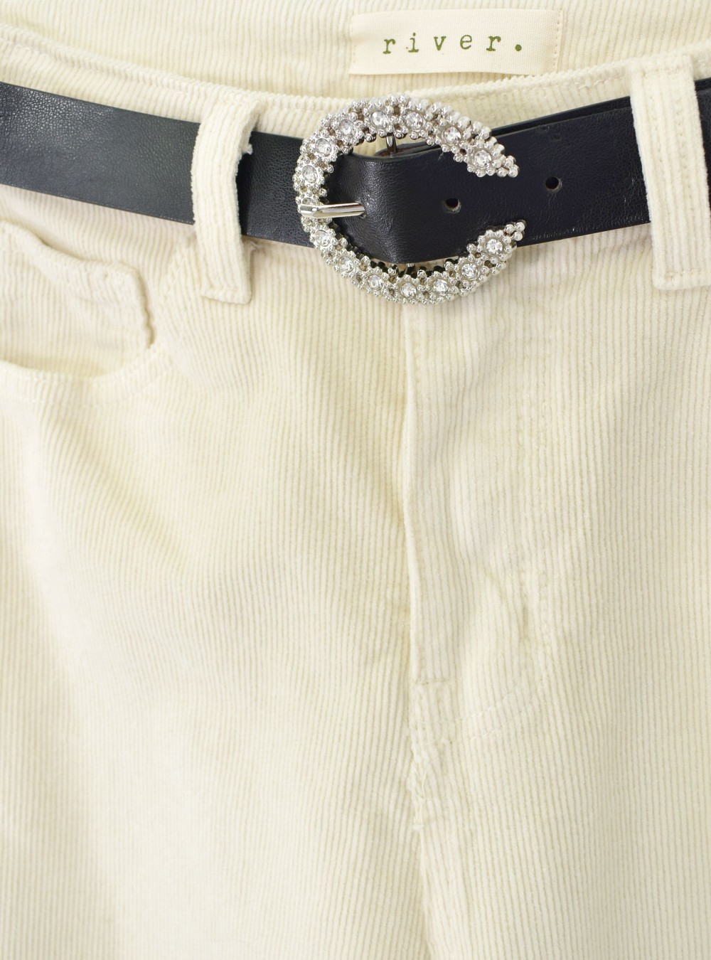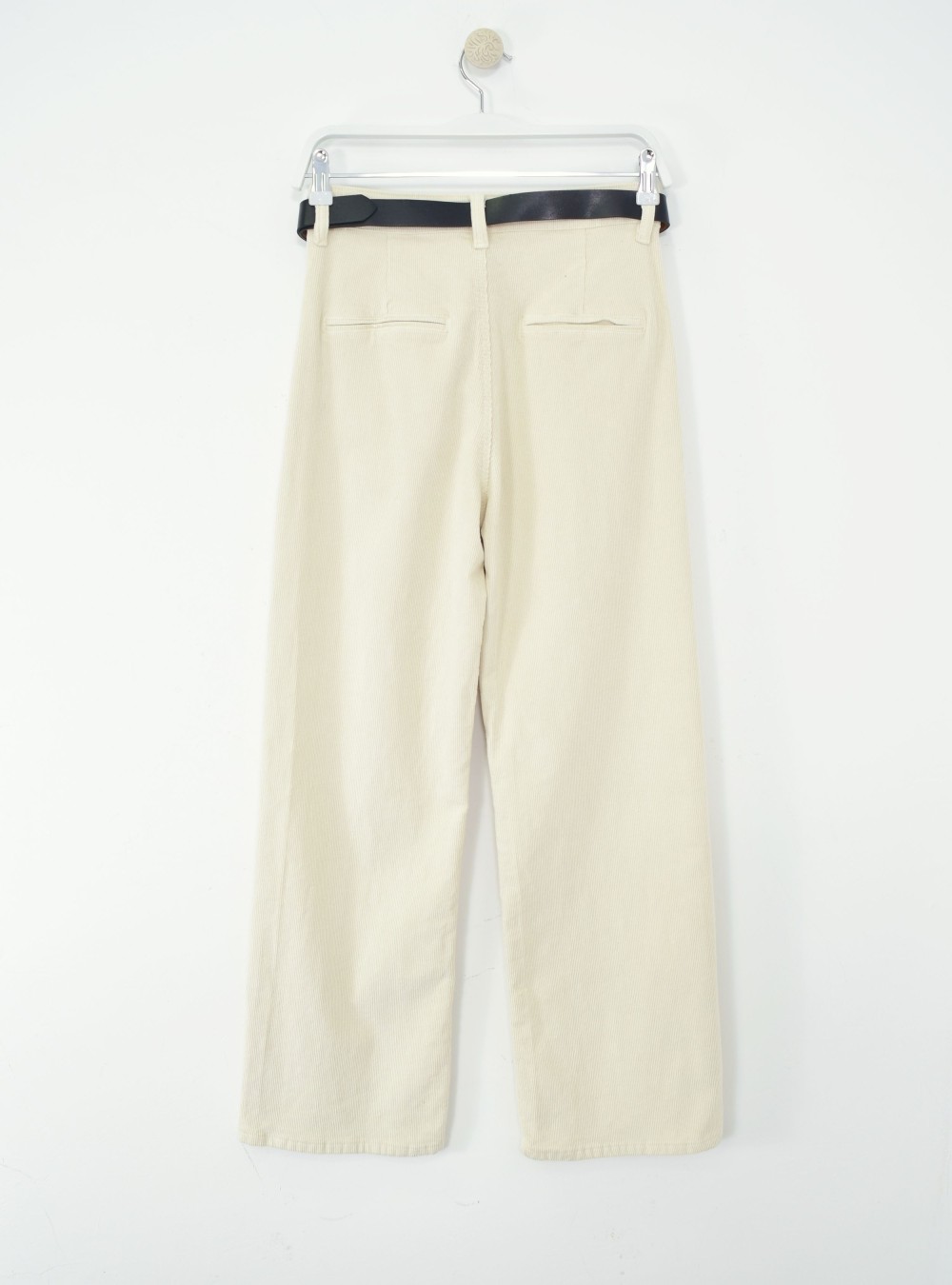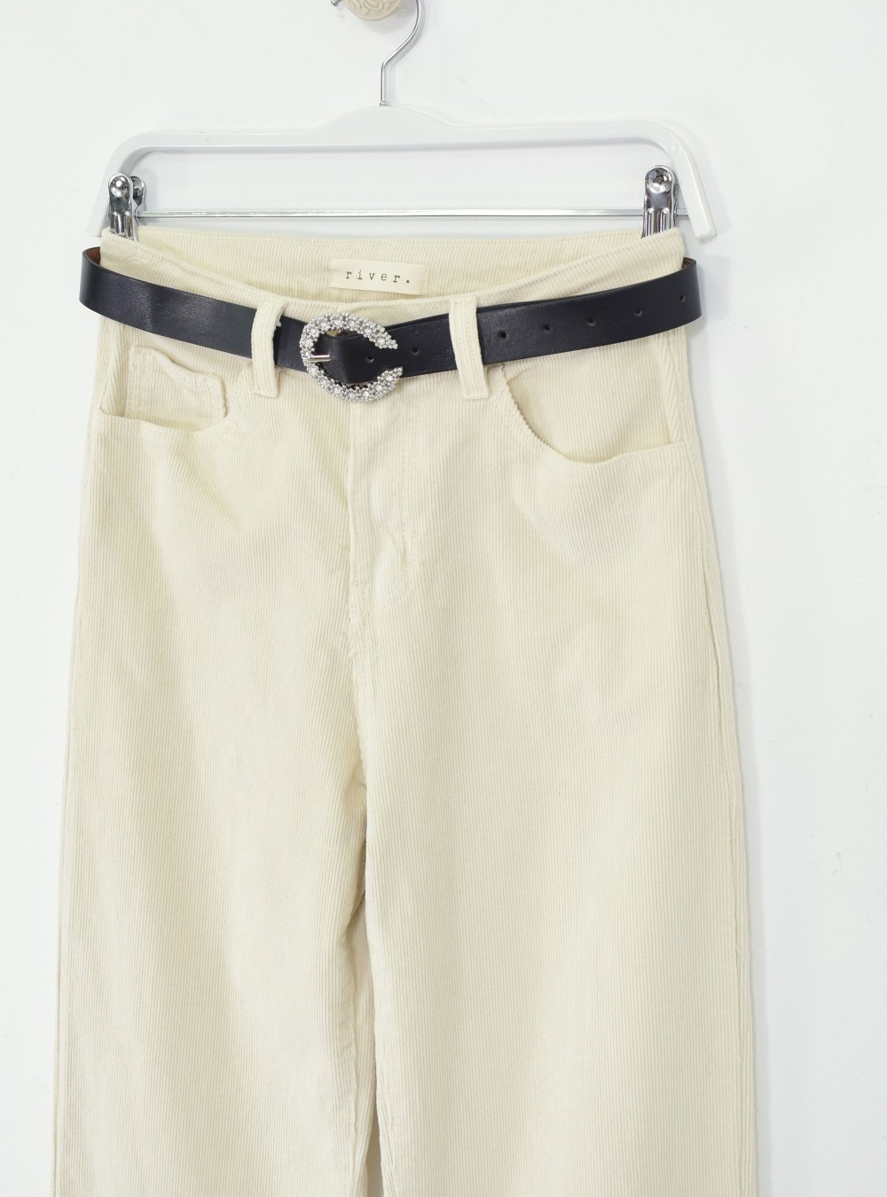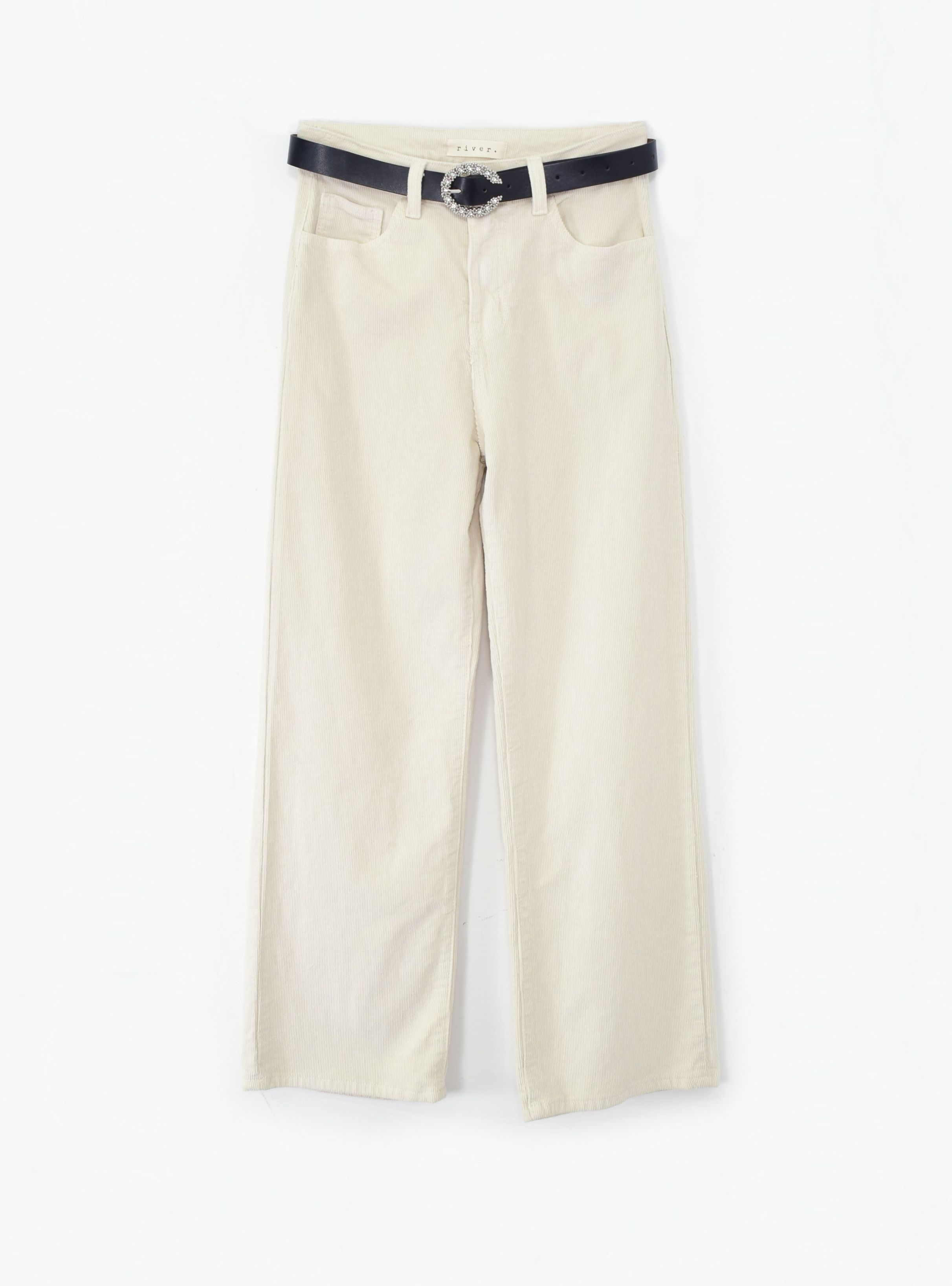 Pantalón de pana en tejido de algodón súper suave y complementado con un cinturón de polipiel con hebilla de circonitas. Fácil de incluir en casi cualquier look por su color además de darte un toque te estilo por corte y cinturón en tu look.