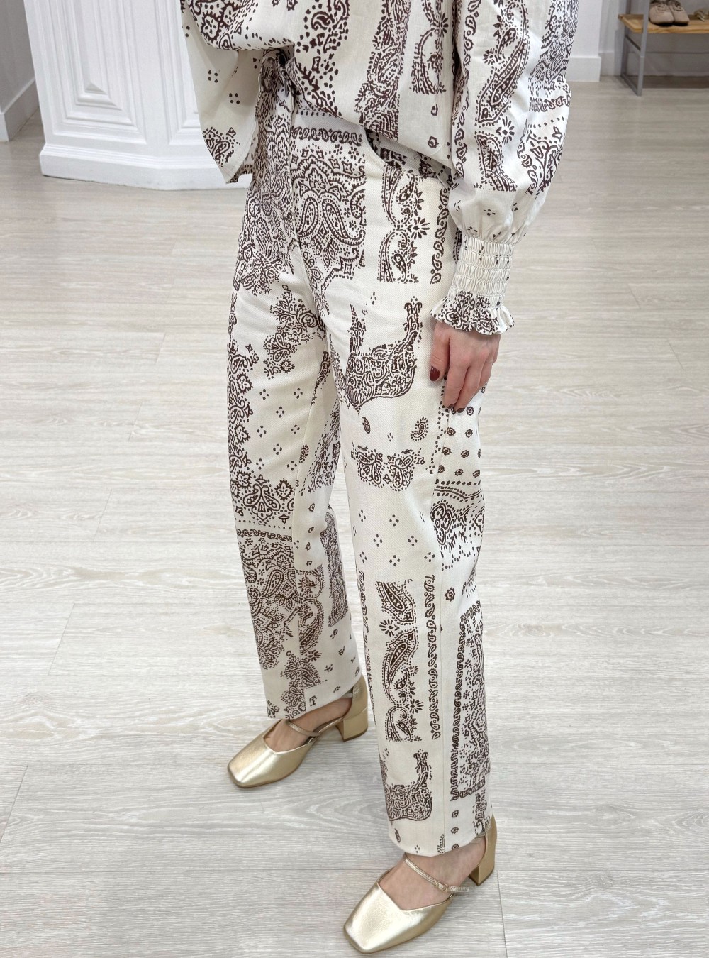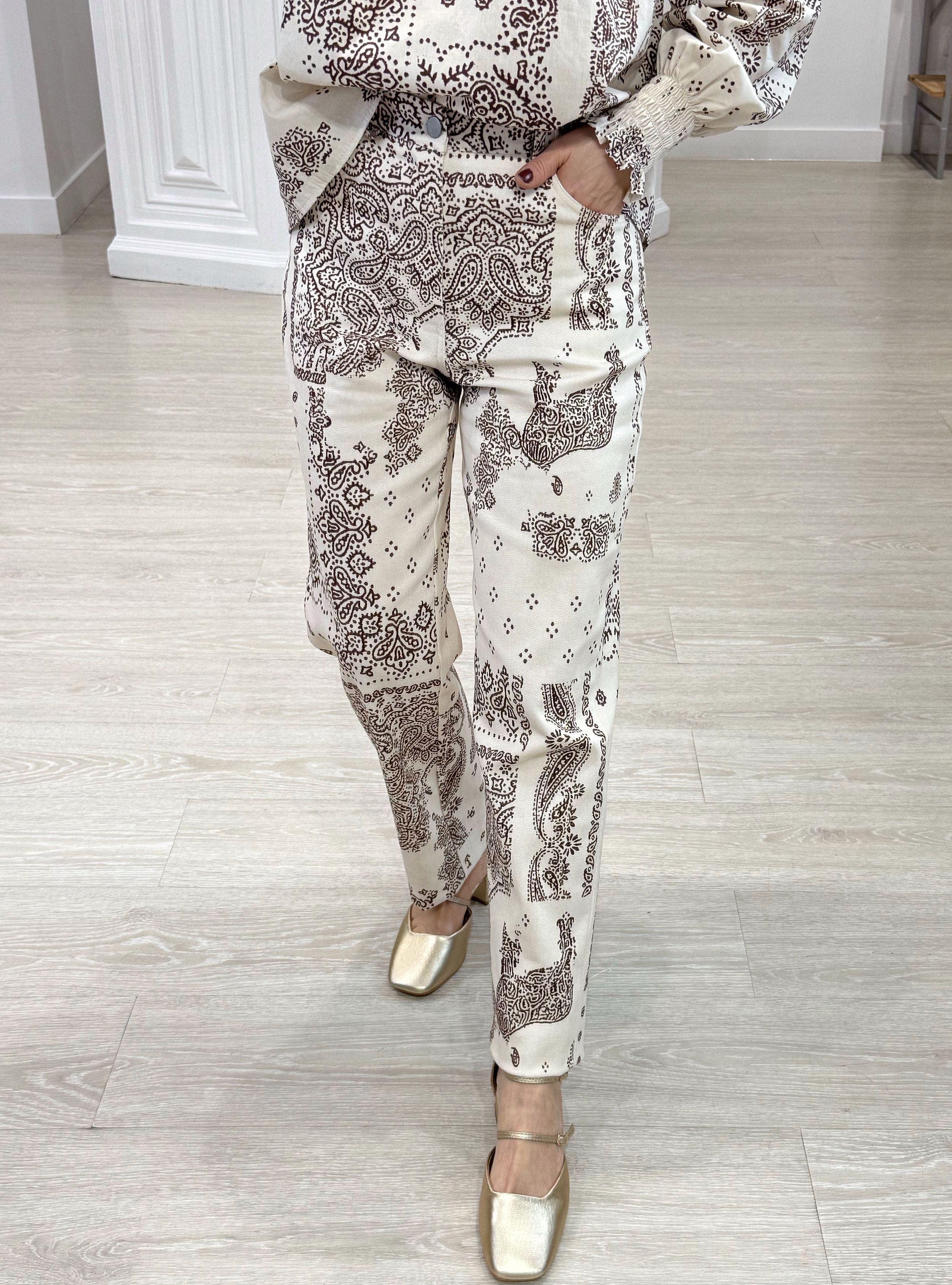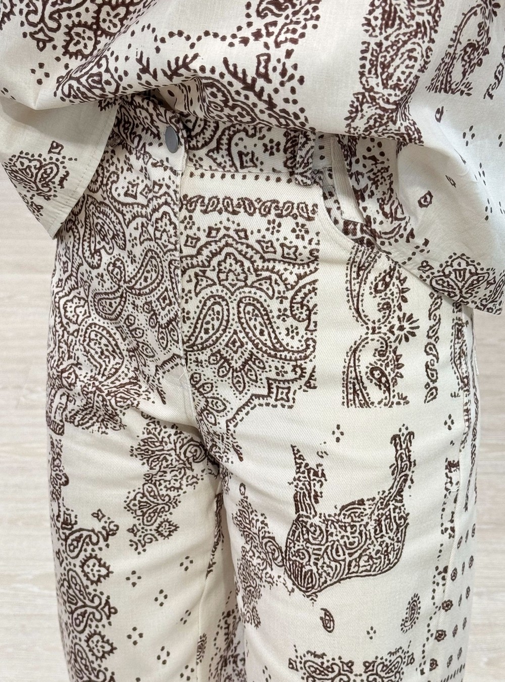 Pantalón de algodón y corte tipo mom con un bonito estampado en color marrón sobre fondo beige. Cierre por cremallera y botón. Tiene dos bolsillos por delante y dos por detrás. Tejido ligeramente elástico que hace que sea súper cómodo. Combínalo con partes de arriba lisas o si prefieres un total look con la Blusa ml set Hanga.