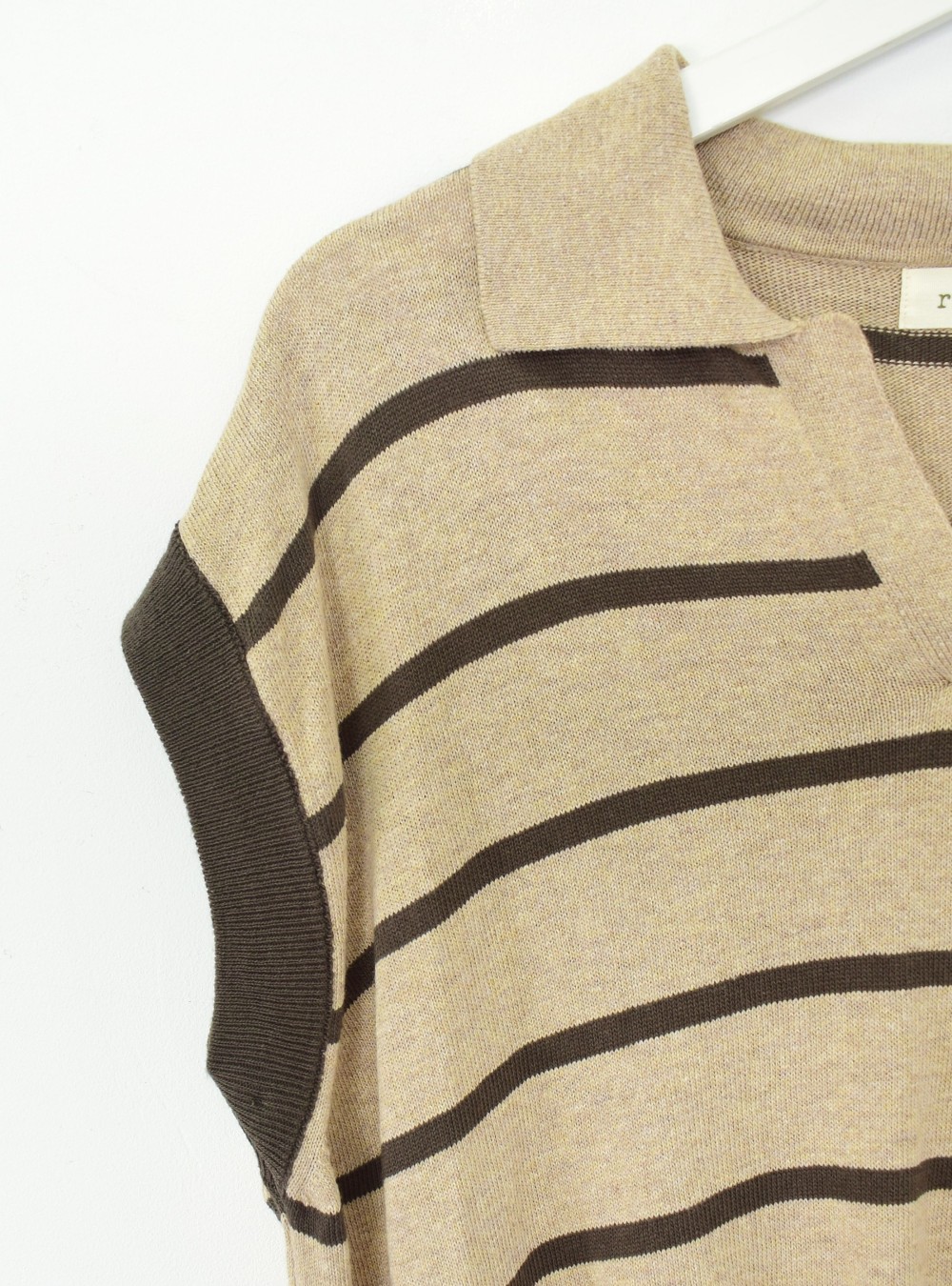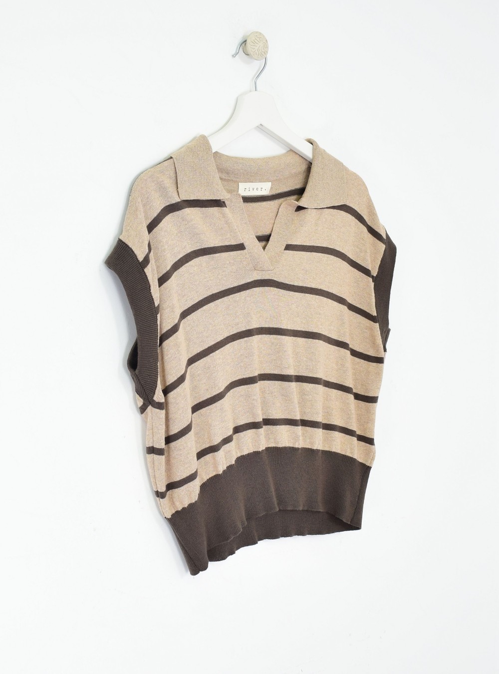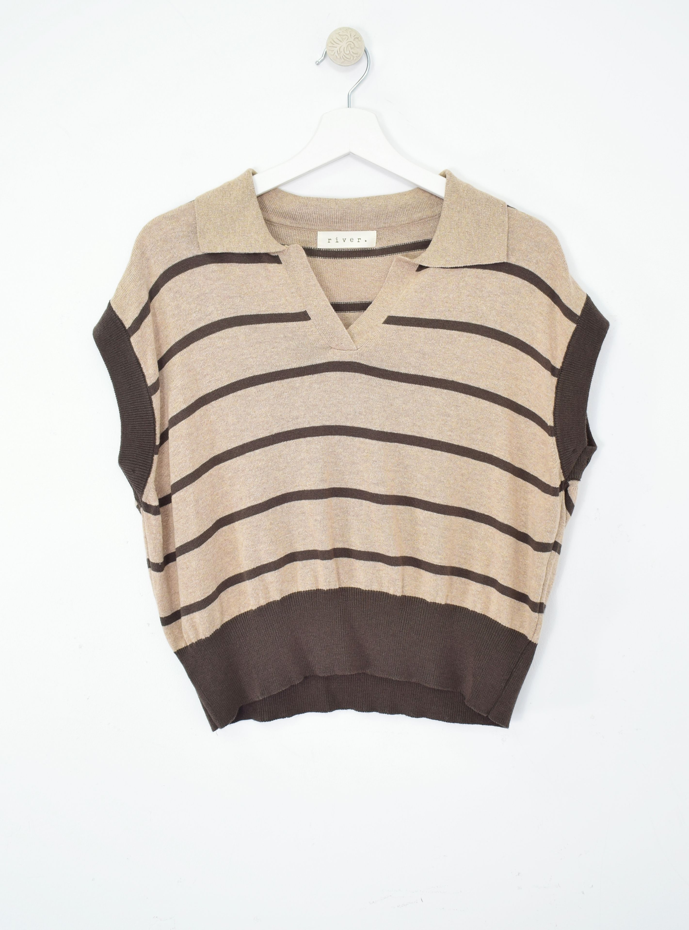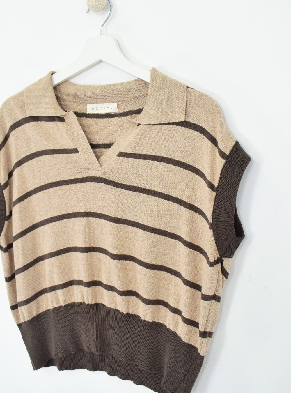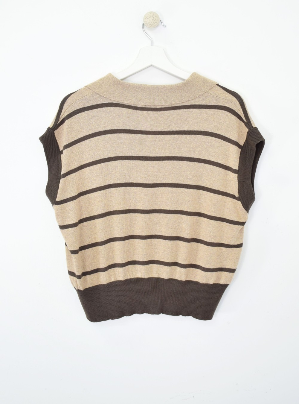 Polo en tejido de punto y sin mangas con cuello en pico y estampado de rayas color chocolate sobre fondo tostado. Borde de mangas y bajo en color chocolate y tejido de canalé. Sienta espectacular con partes de debajo de tonos claros, beige, tierra topo, café…, si lo combinas con negro o azul marino puede ser que la combinación marque tendencia en tu vida diaria.