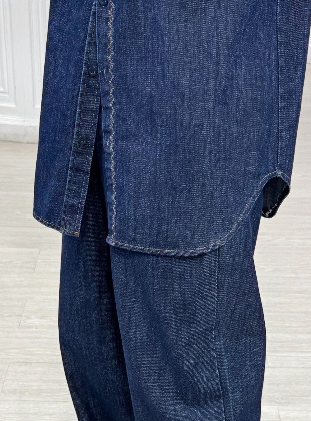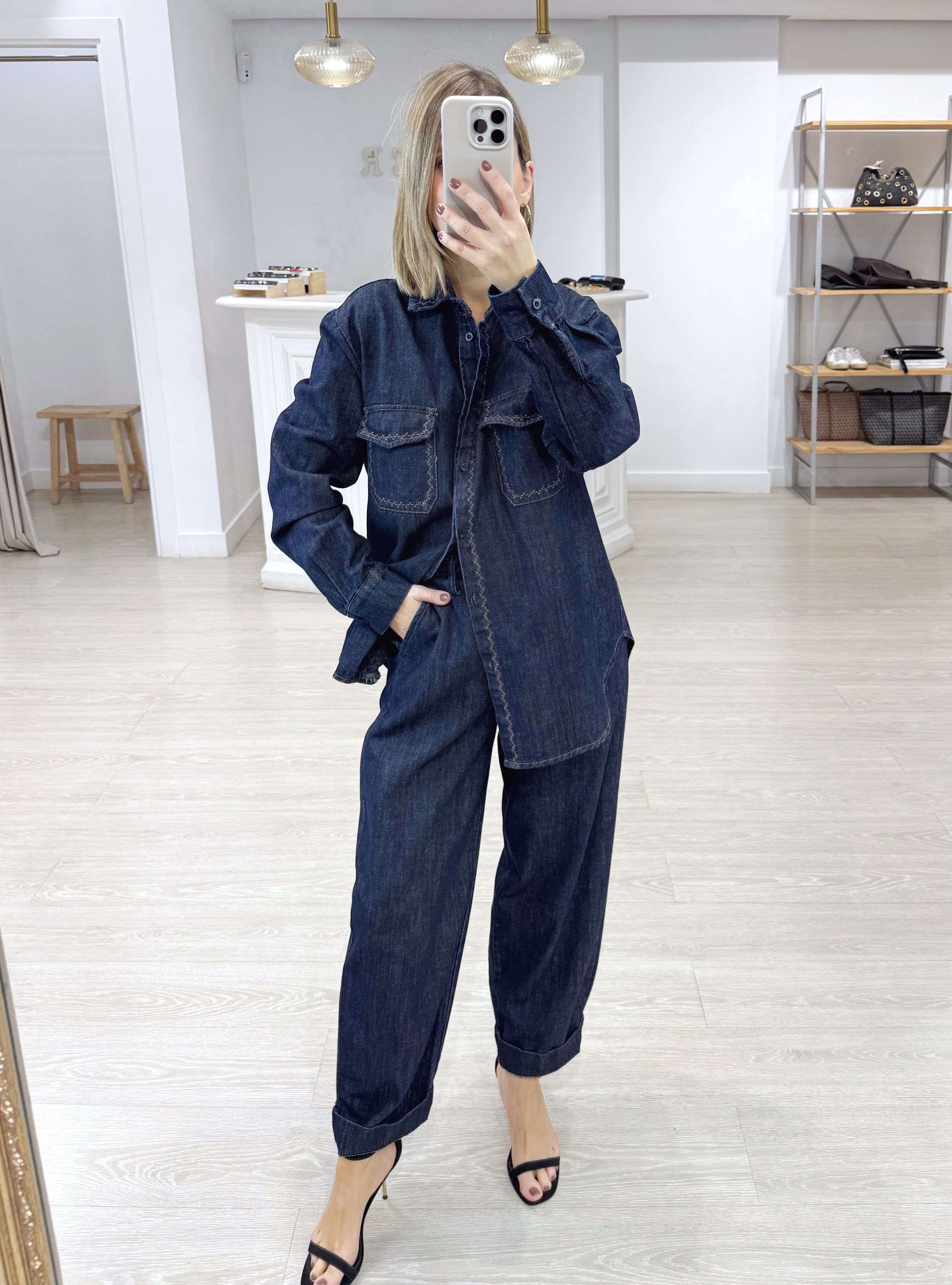 Sobrecamisa en tejido denim de algodón, cuello camisero y cierre por botones también en los puños. Tiene dos bolsillos de parche en el pecho y un bordado simétrico en hilo marrón en el cuello, línea de botonadura y borde de los bolsillos. Perfecta para combinar con tus jeans y faldas favoritas o si prefieres un total look espectacular póntela con los Jeans balloon cintura elástica.