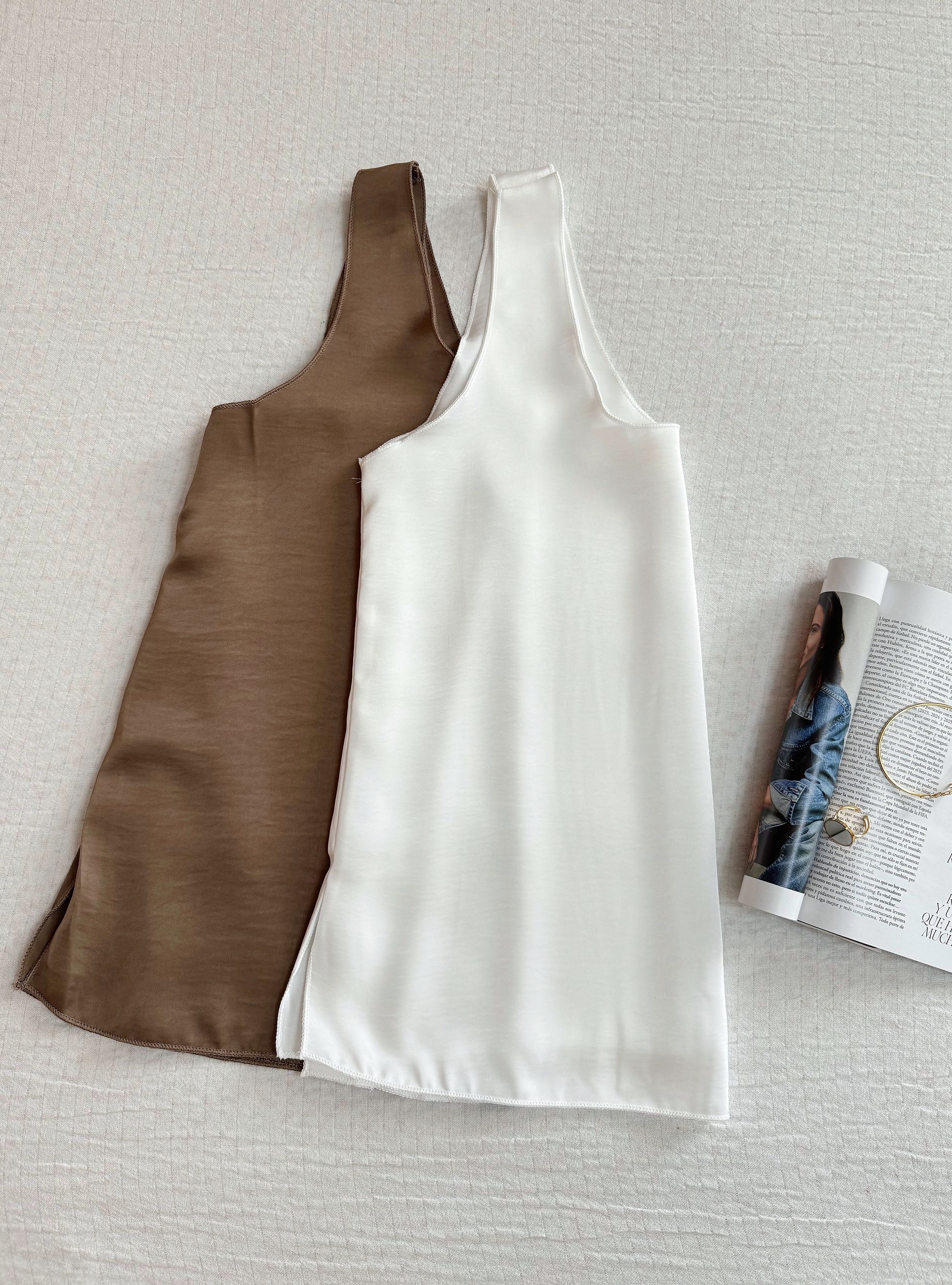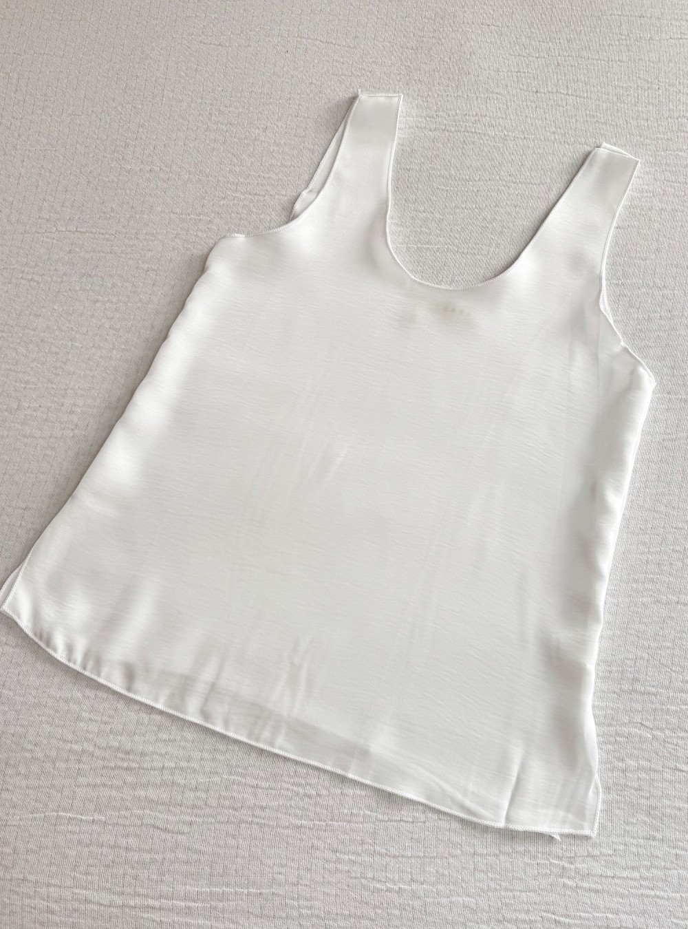 Top satinado de tirante ancho. Escote redondo. Tejido con cierto efecto arrugado. Aberturas en los laterales. Tejido con mucho movimiento.