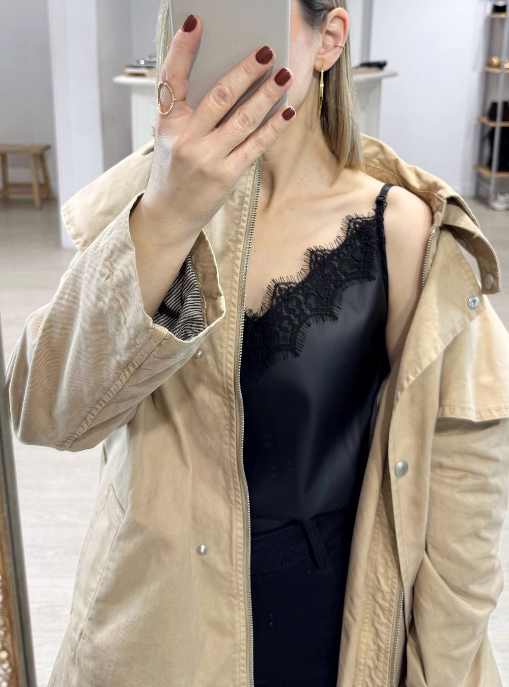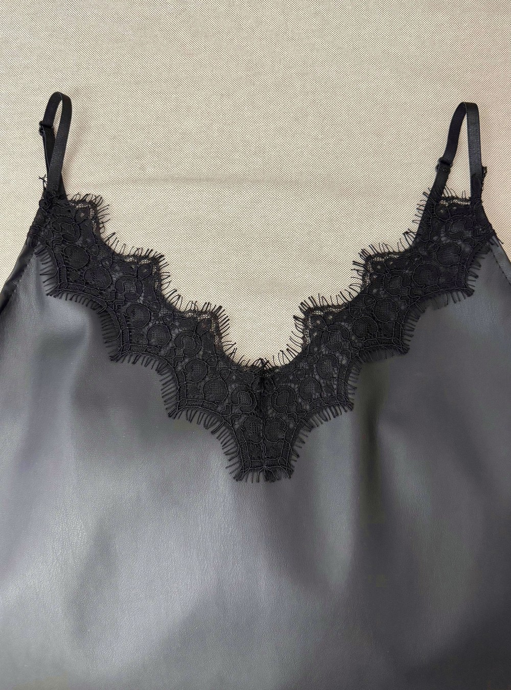 Top lencero efecto piel. Tirantes regulables. Escote en uve con puntilla.
