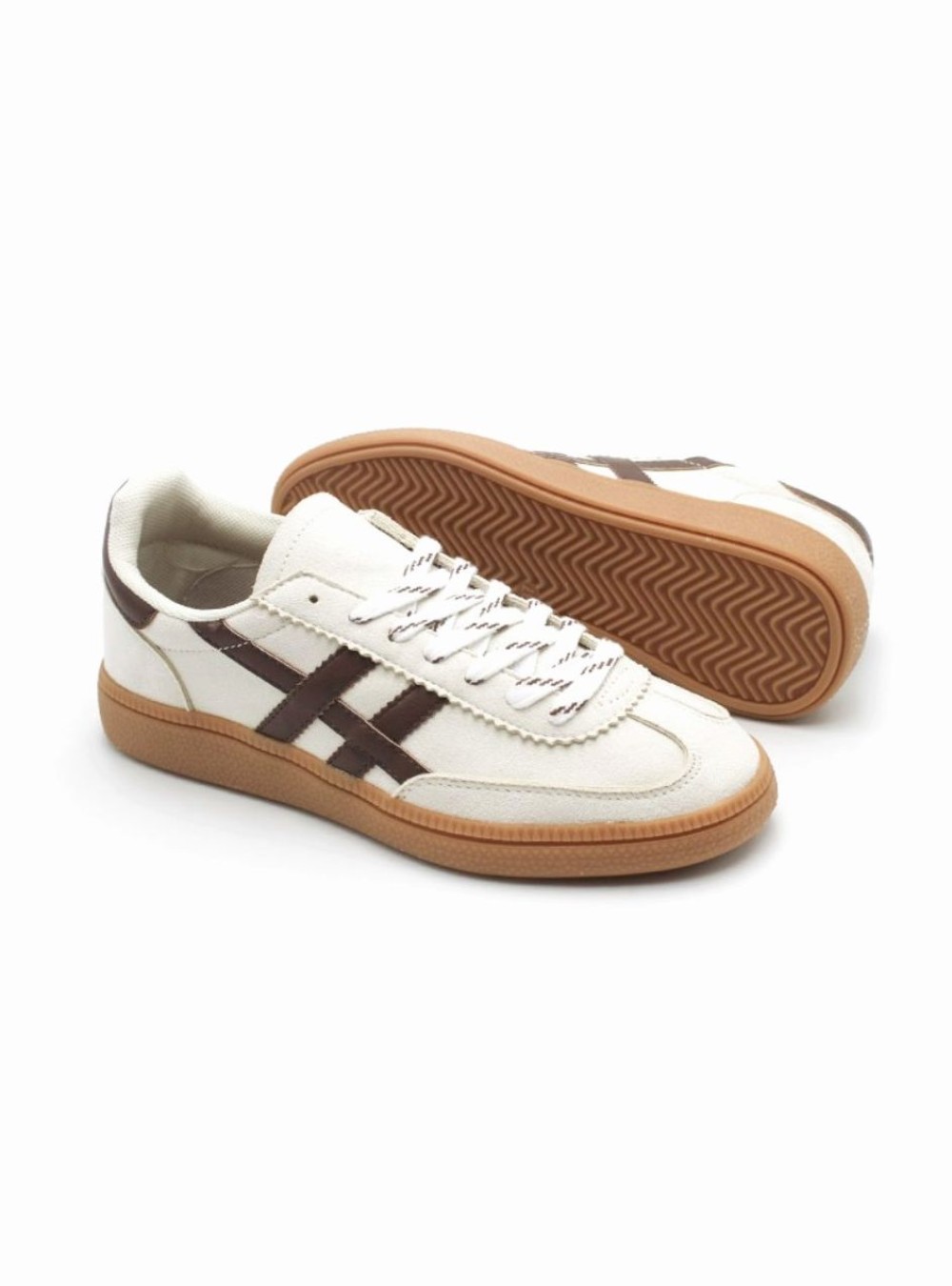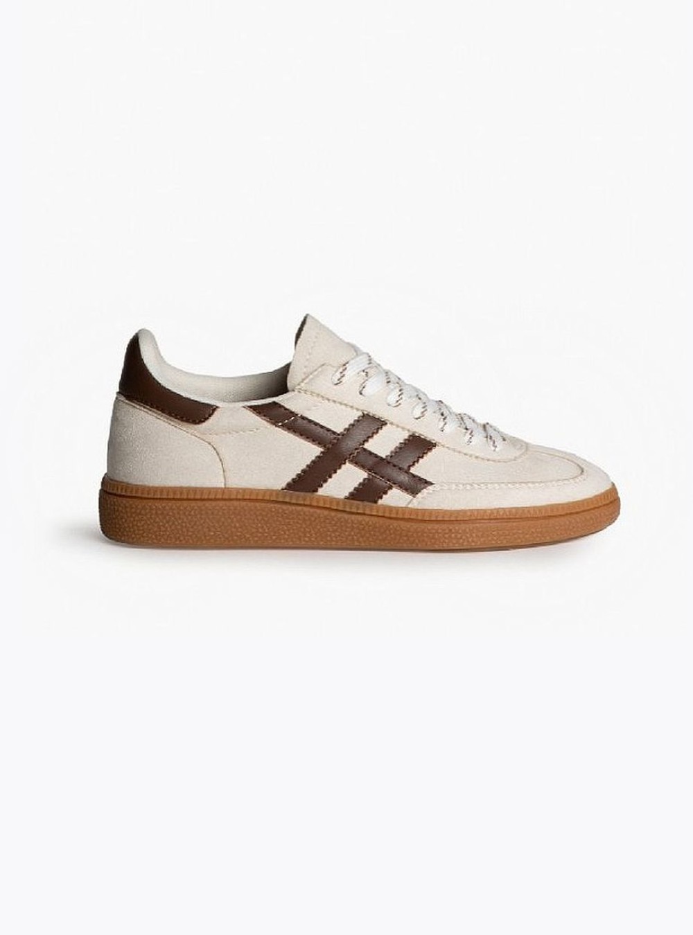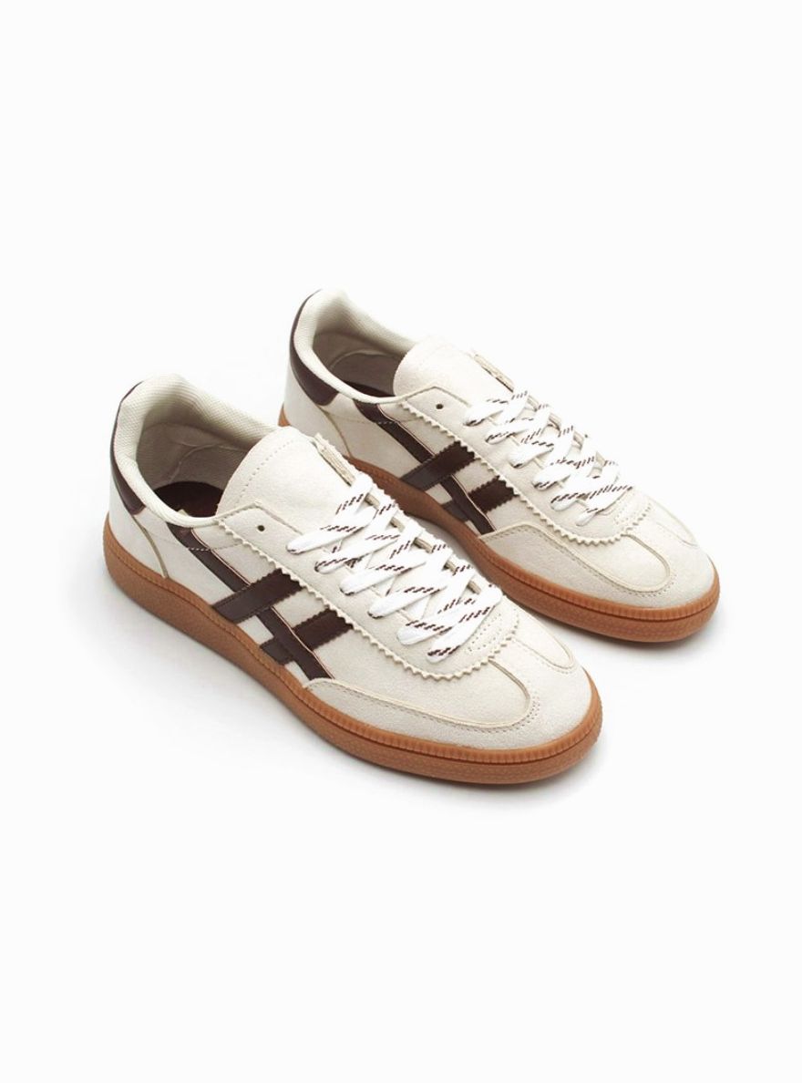 Zapatilla deportiva de estilo retro con acabado en diferentes materiales y texturas. Suela de color tocino y detalles laterales en color chocolate. Cierre por cordones y plantilla de espuma para una mayor comodidad. Zapatilla de tendencia que te combina con casi cualquier combinación de prendas.