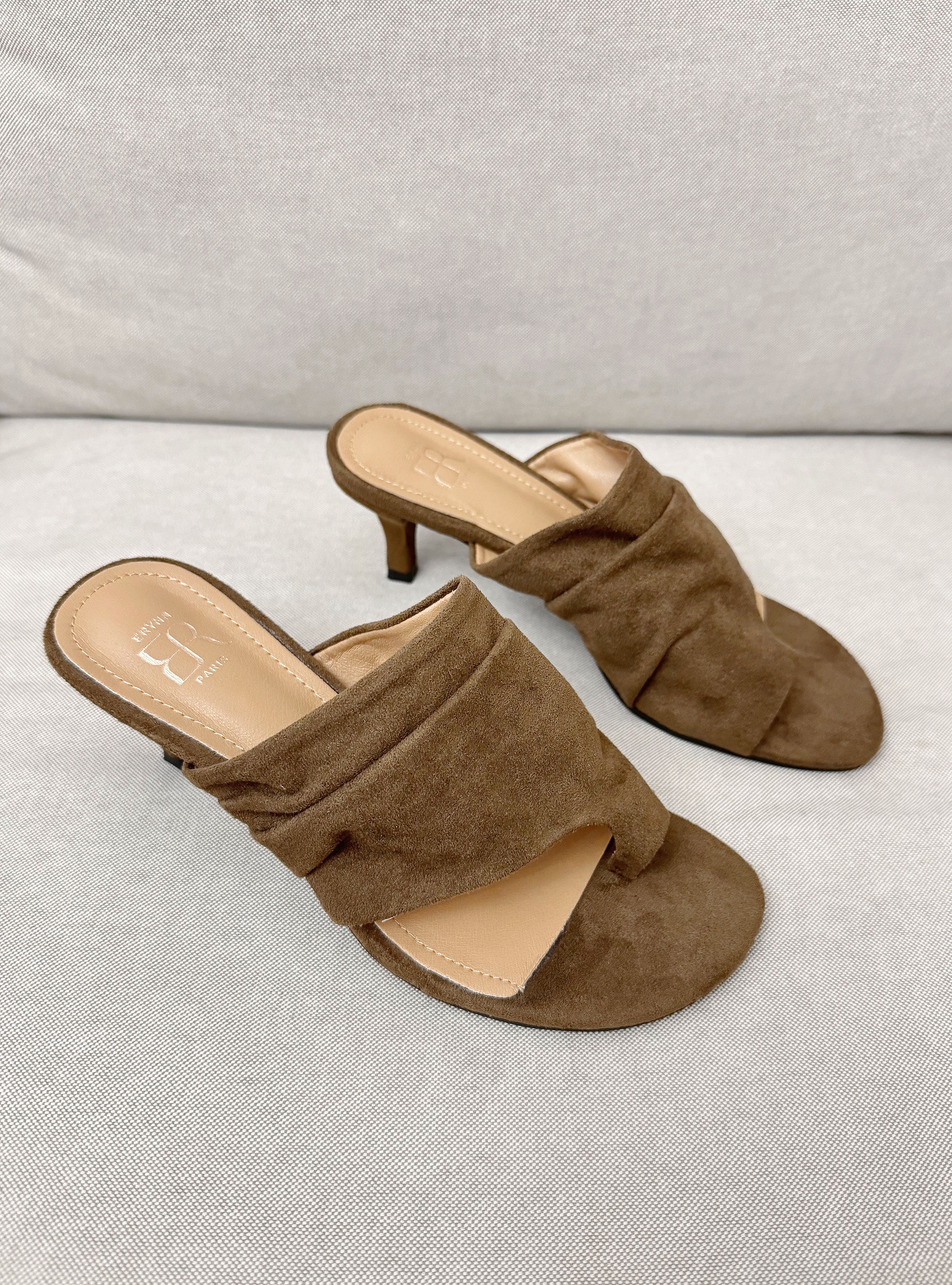 Sandalia de tacón con drapeado en la zona del empeine. Plantilla confort. Tiene el color de la temporada, el tacón de 5 cm es cómodo permite llevar estas sandalias tanto para looks diarios como para otros más formales.